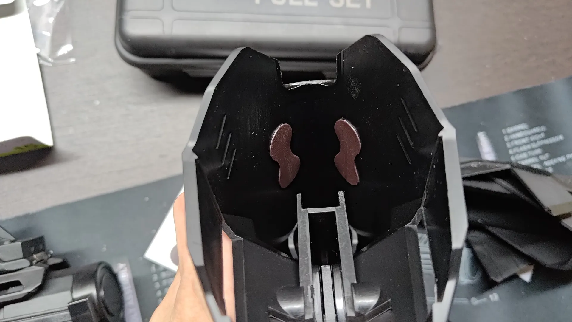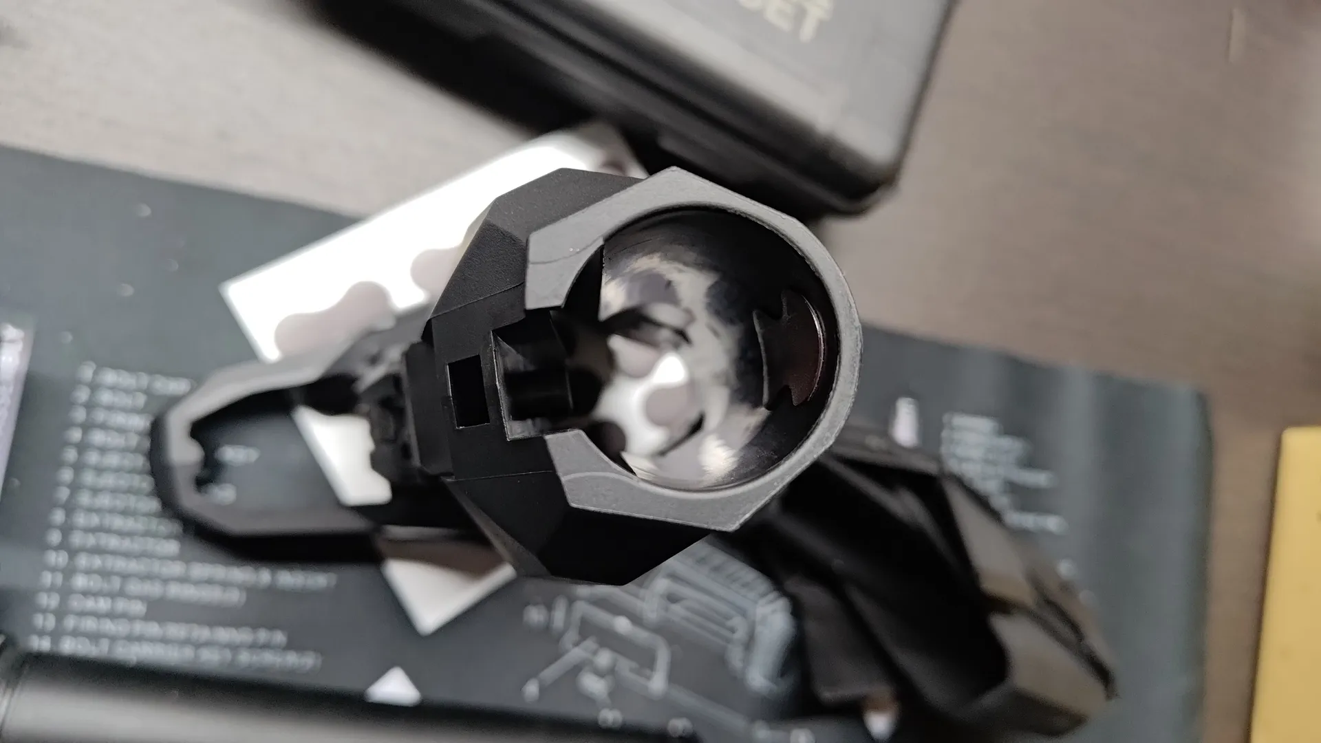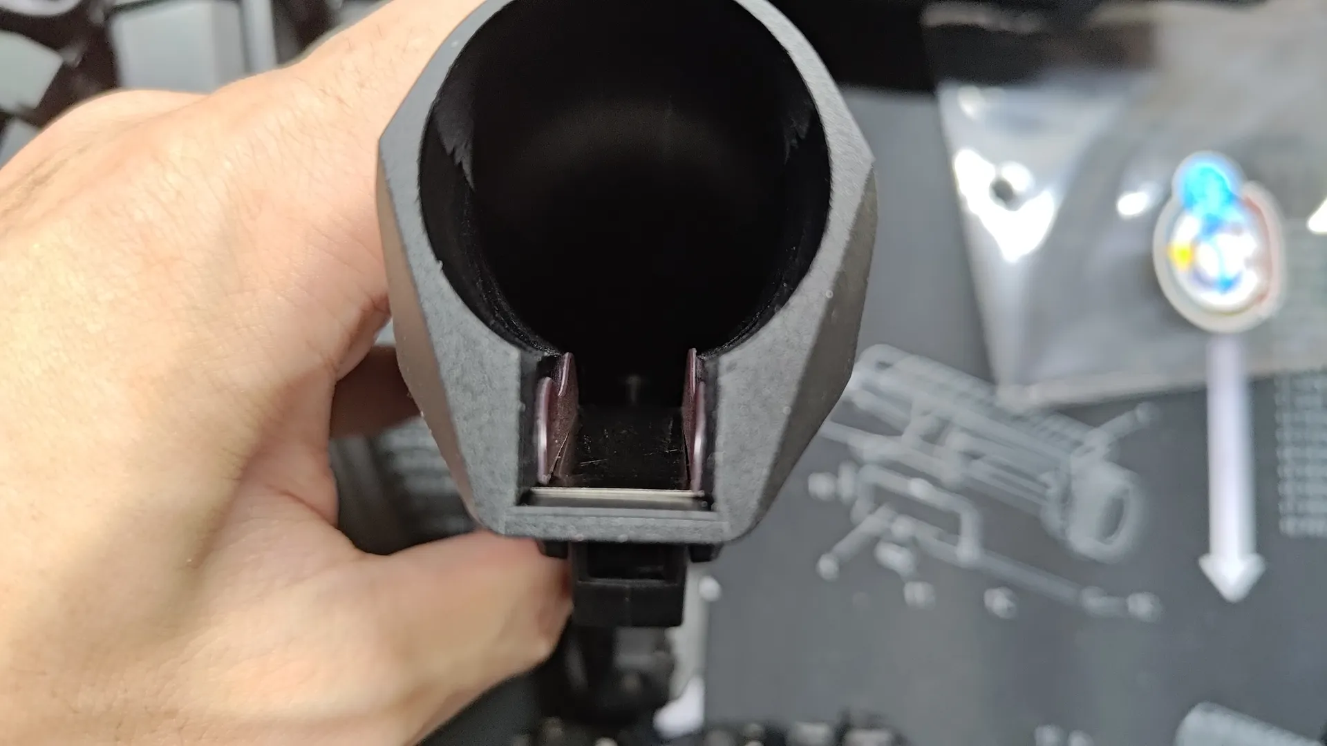 後ろ側の上下のガタも同じように……と行きたかったのですが、どうやらこのストックは形状が少し特殊になっており、バッファーチューブの天面がストック後端の天面に接しておらず、両サイドの斜め上の部分が接しているようだったので接している部分を盛るようにテープを追加しました。
