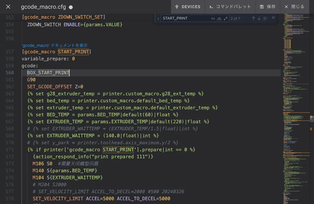 ファイルが開けたら[gcode_macro START_PRINT]という項目を探してください。