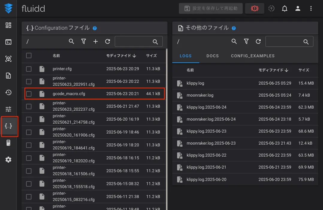 今回設定を変更するのはConfigurationファイル二表示されているgcode_macro.cfgというファイルになりますので、そちらを開きます。