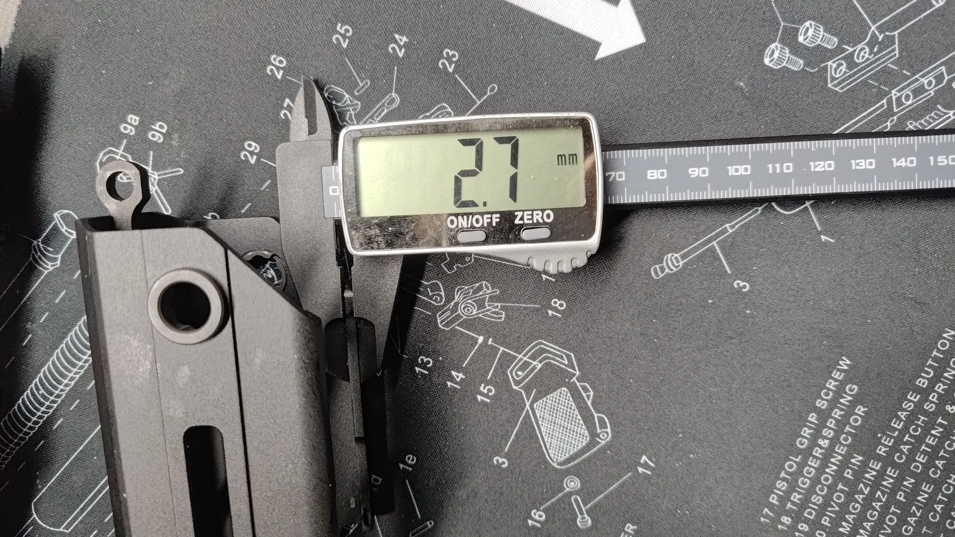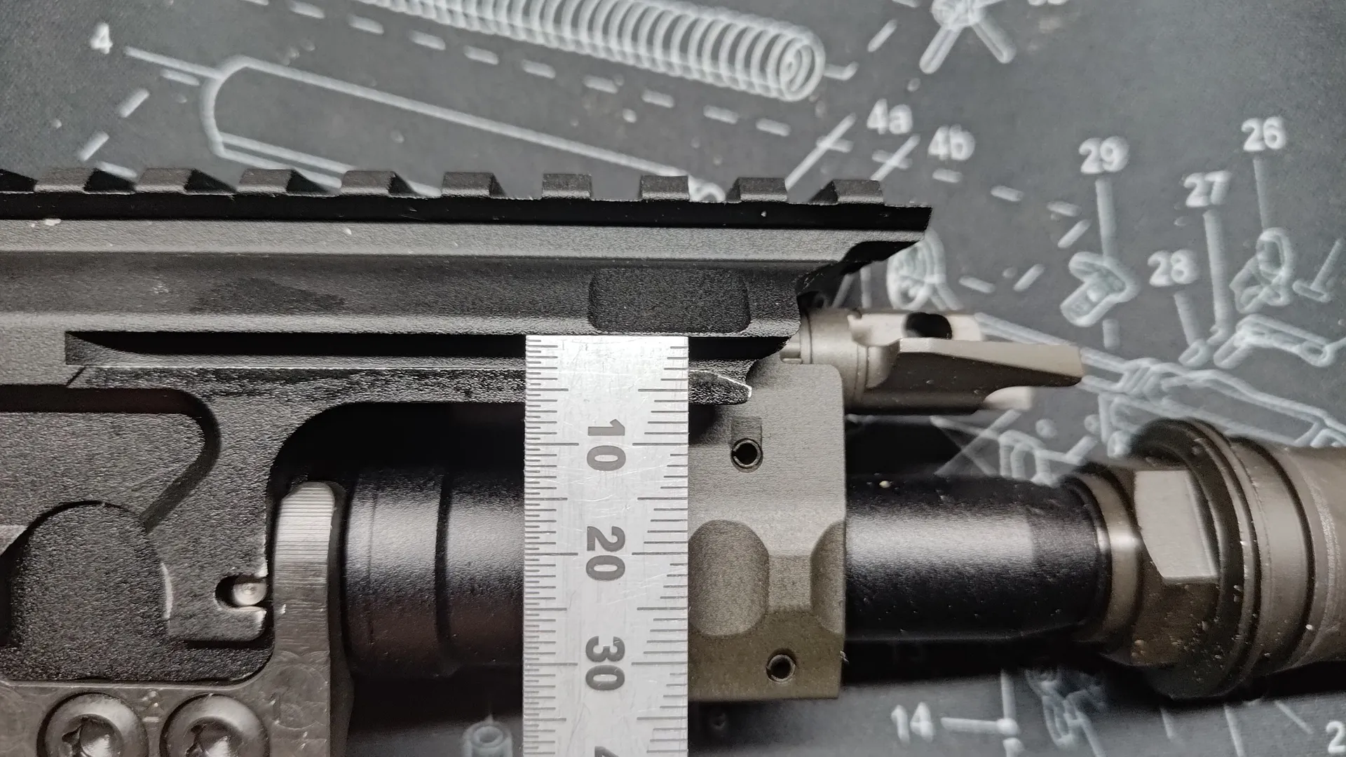 細い箇所なのでノギスだと測りづらく、スキマゲージも今は所有していないので差しで測りますが、どうやら2.9mmないし3.0mmほどあるようです。(salvoも念の為測ってきましたが、やはりハンドガード側と同じ2.4mmほどでした)