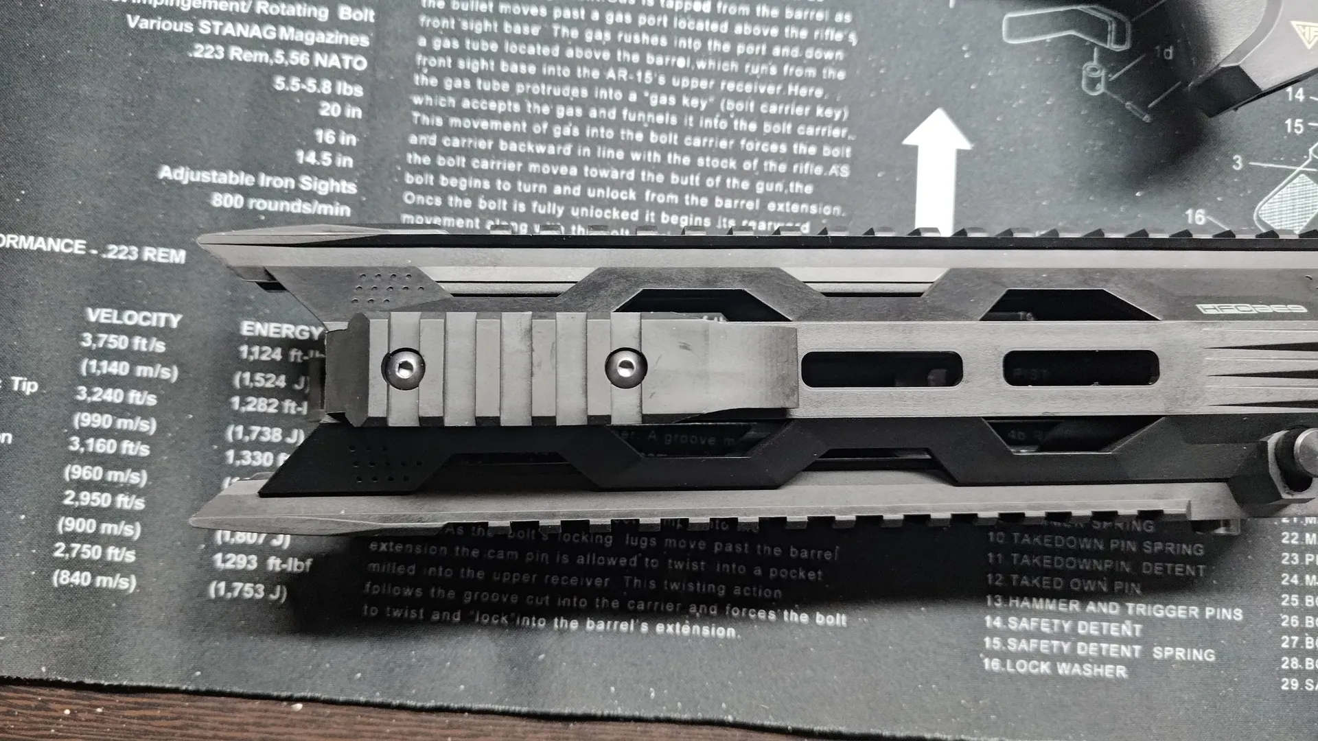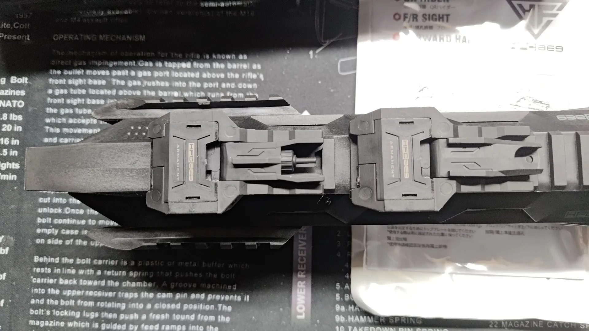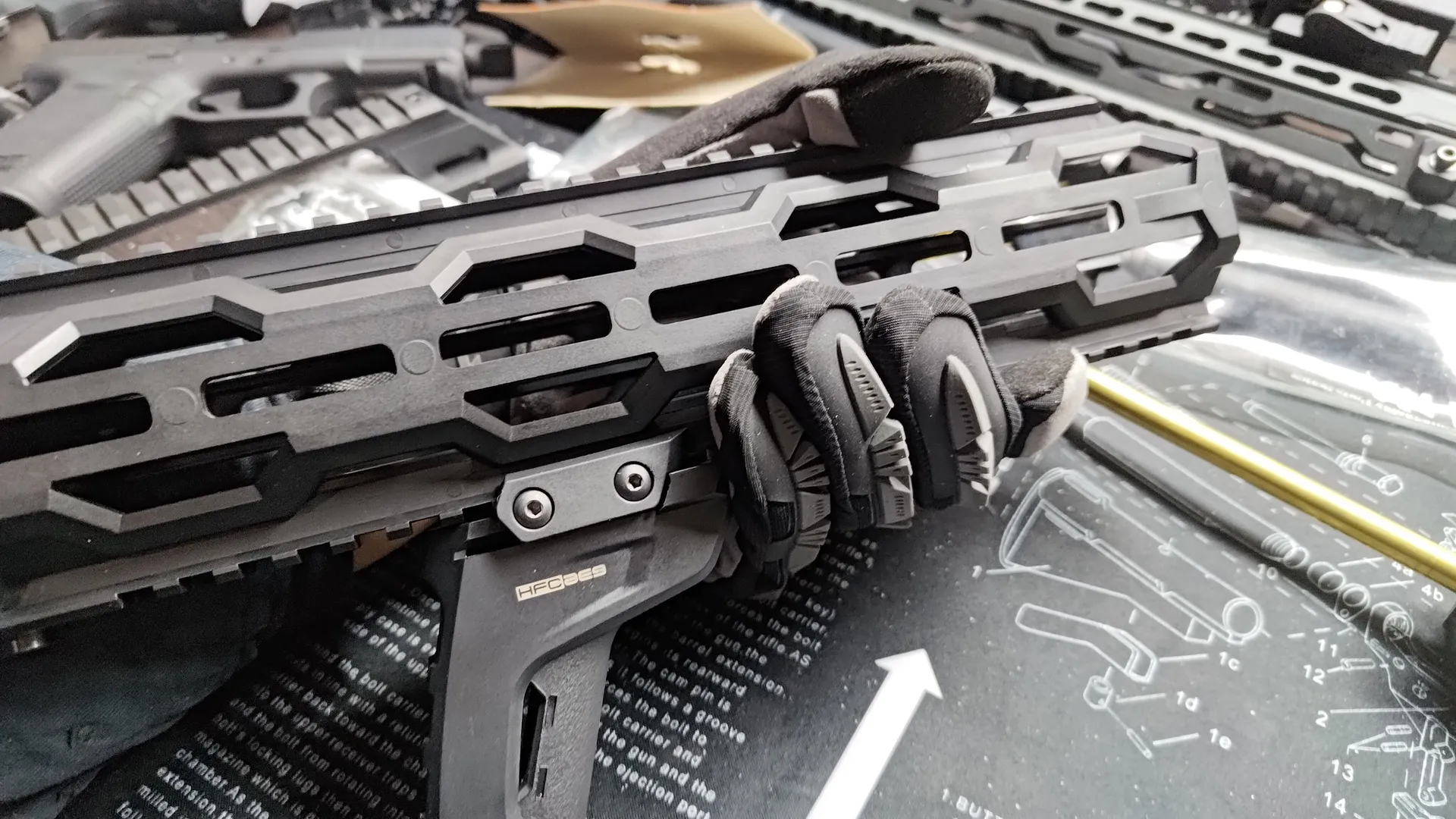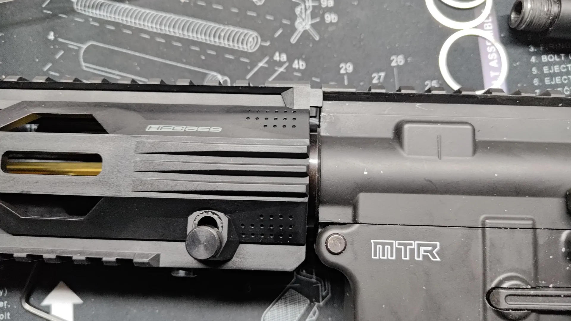 構造上レールへの挟み込みがきちんと行われないと、上部のストッパーを閉めることができないのですが、HFCにハンドガードでも個体差次第ではちゃんと挟み込むのに苦労し、ストッパーが閉められないです。