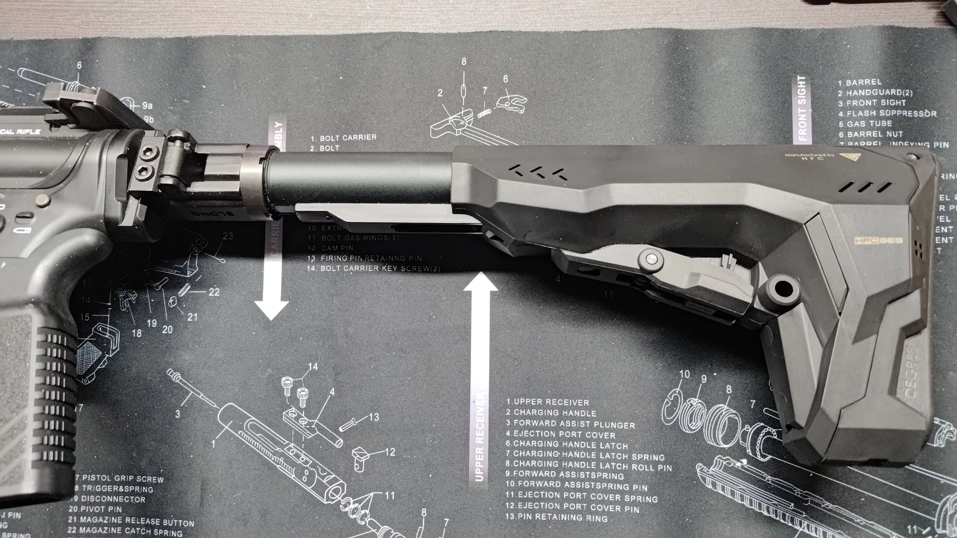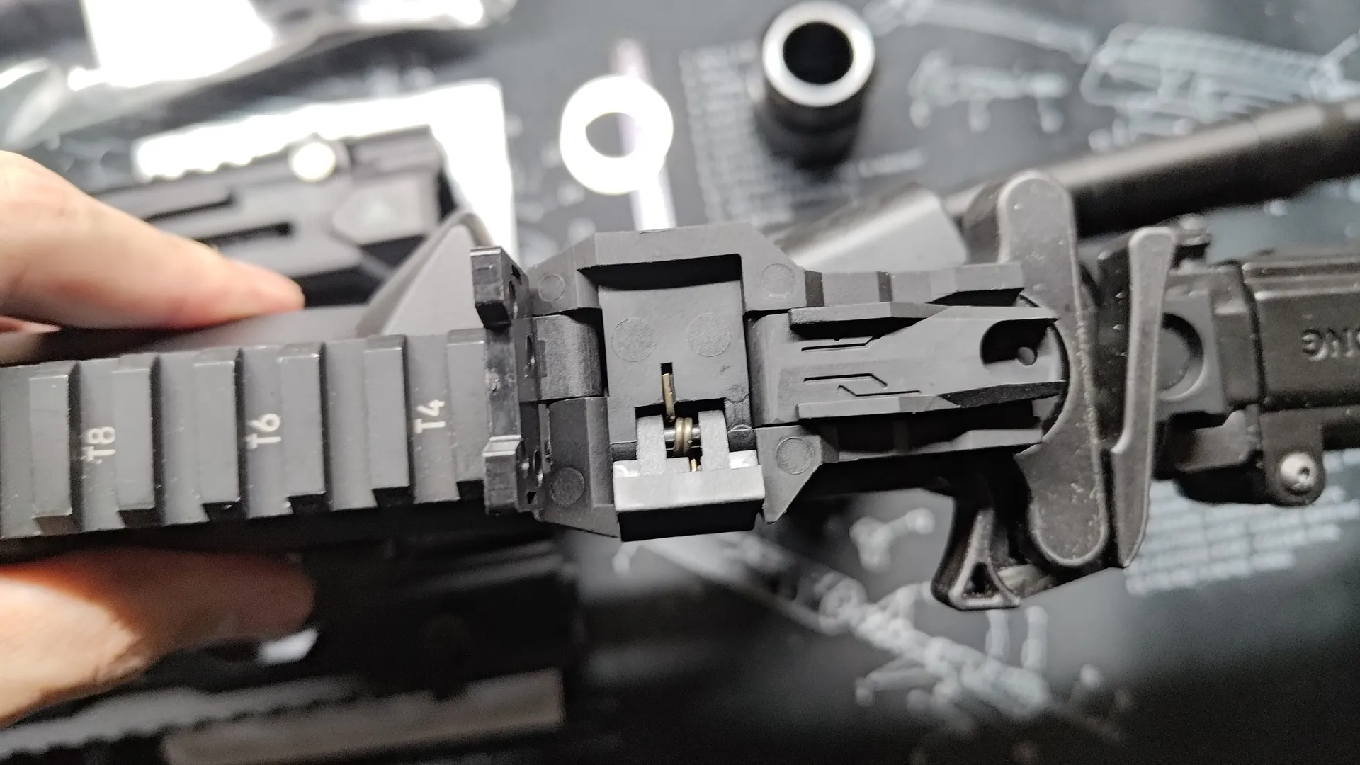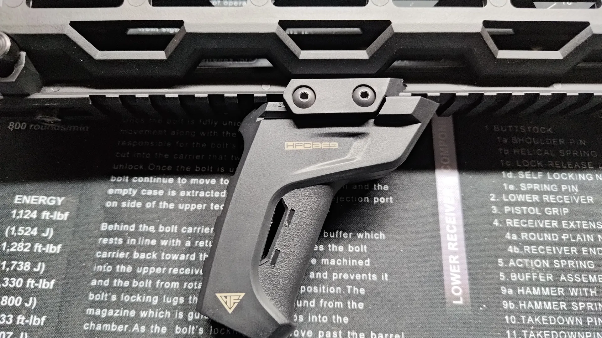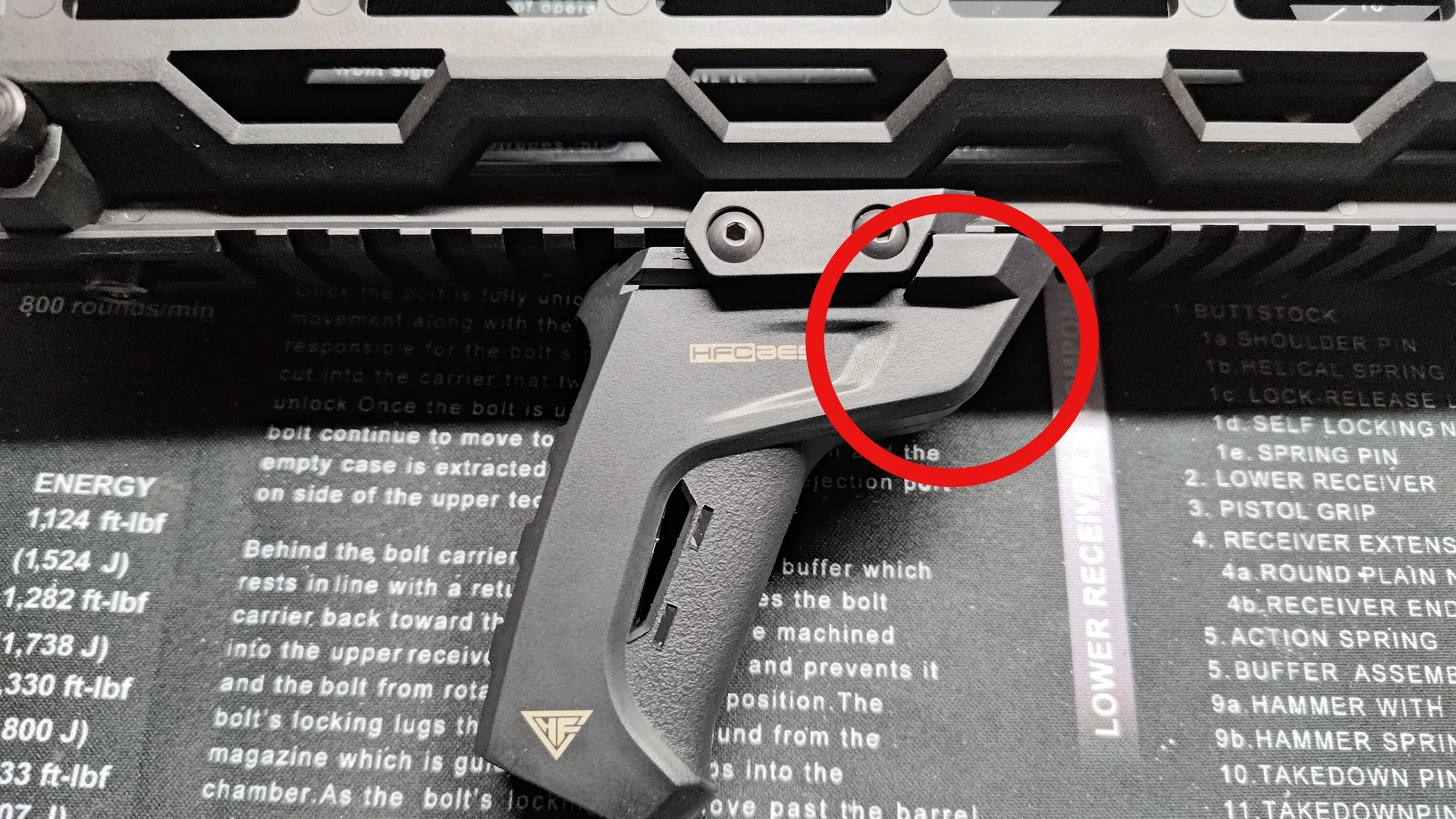 構造上レールへの挟み込みがきちんと行われないと、上部のストッパーを閉めることができないのですが、HFCにハンドガードでも個体差次第ではちゃんと挟み込むのに苦労し、ストッパーが閉められないです。