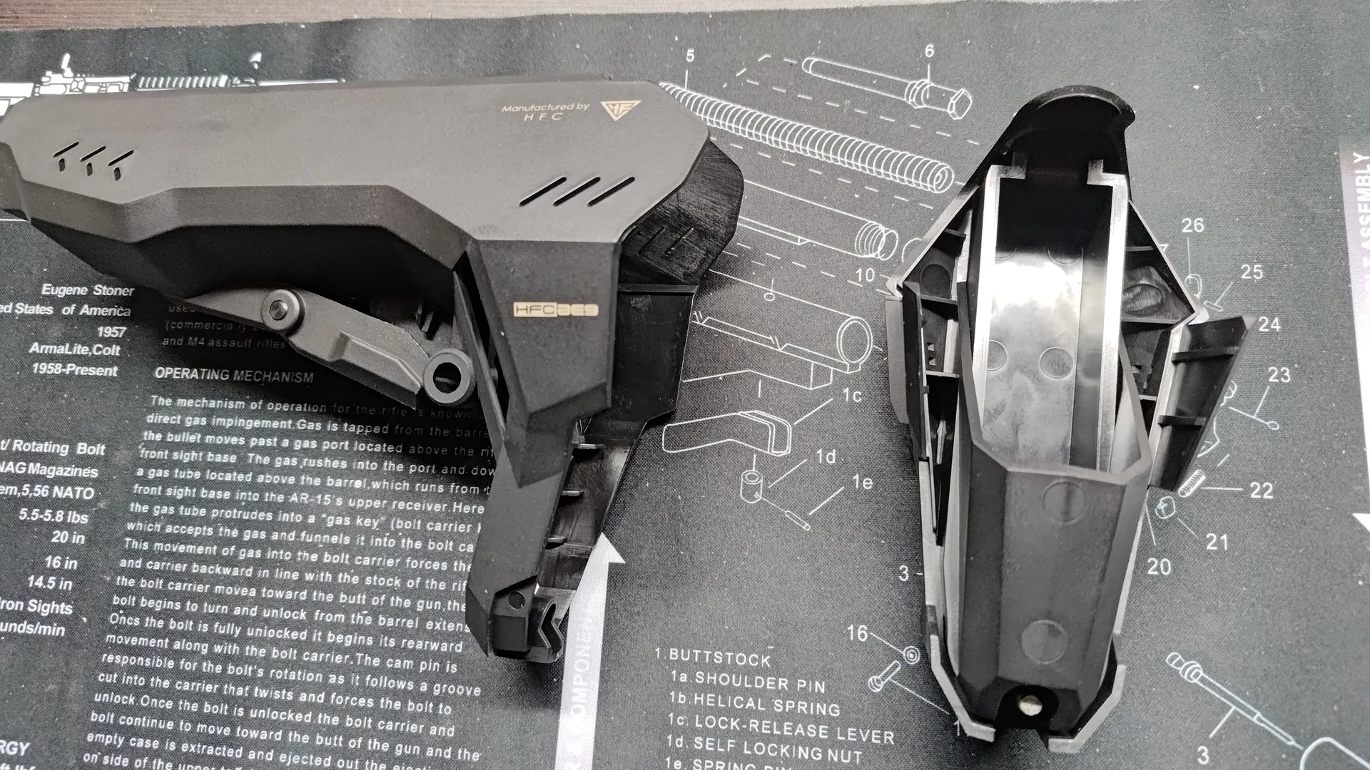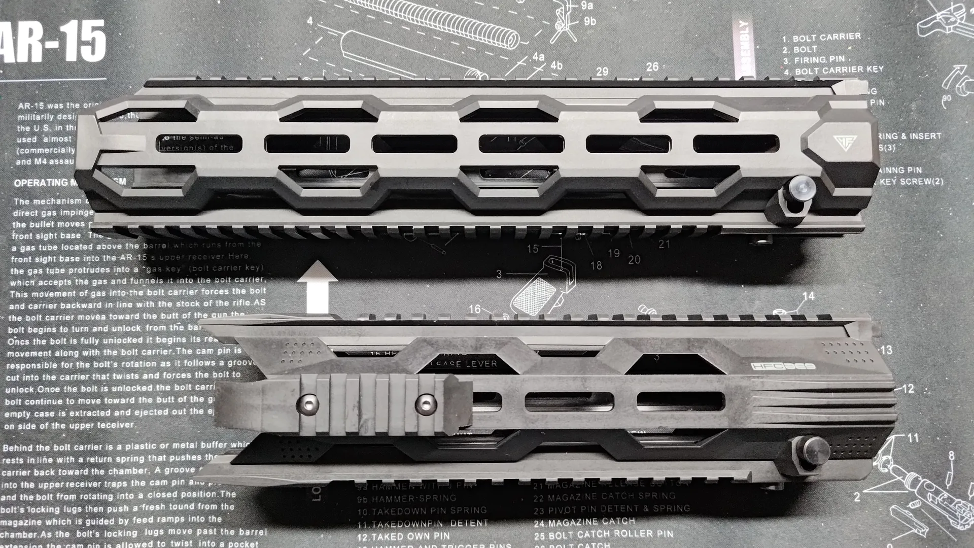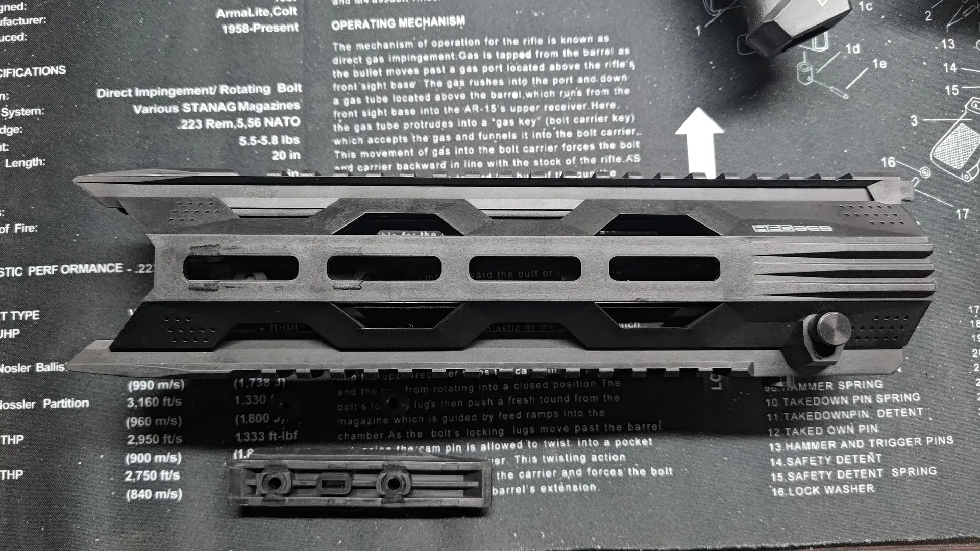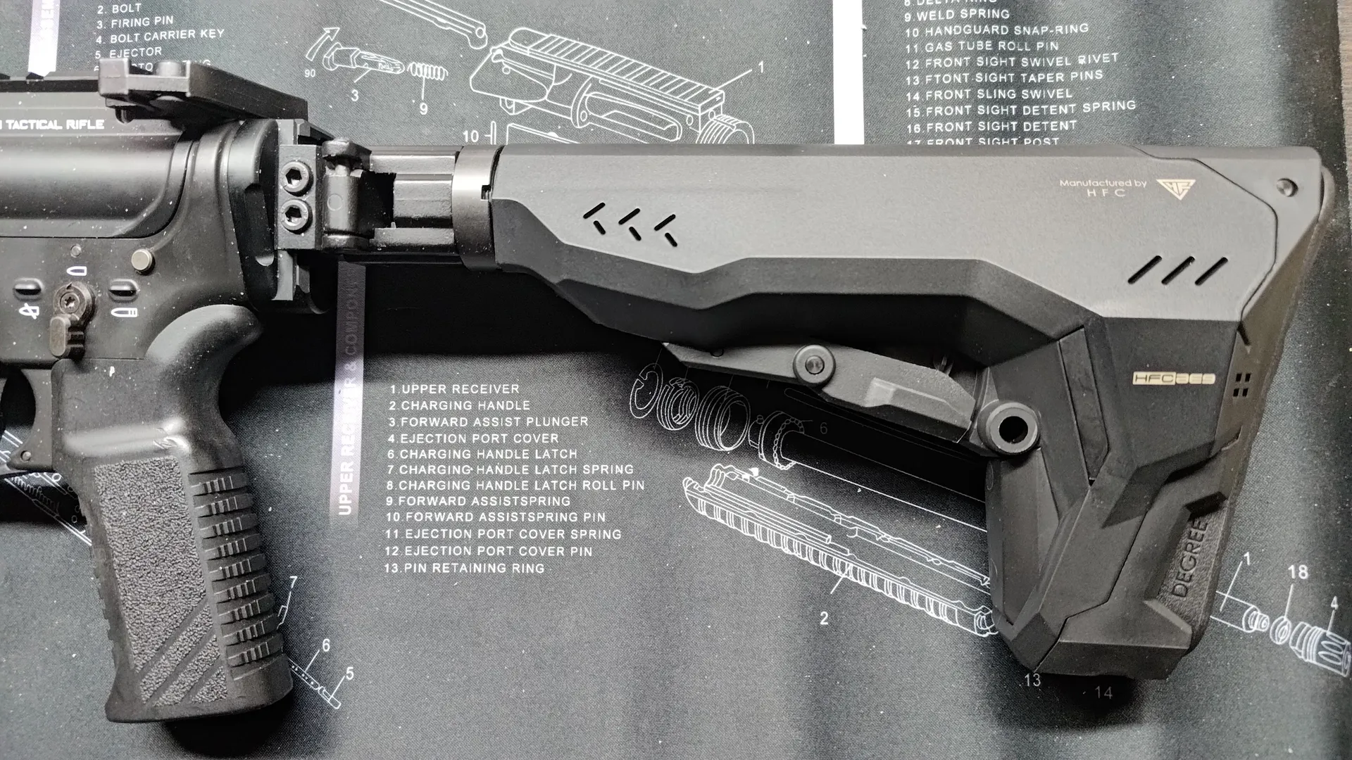 構造上レールへの挟み込みがきちんと行われないと、上部のストッパーを閉めることができないのですが、HFCにハンドガードでも個体差次第ではちゃんと挟み込むのに苦労し、ストッパーが閉められないです。