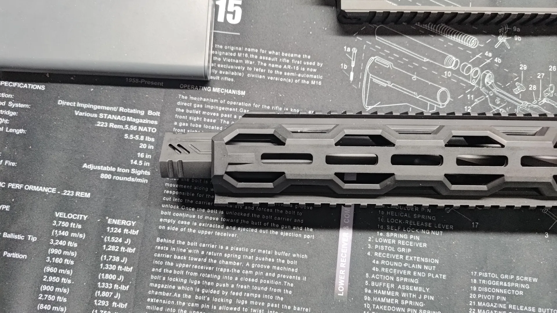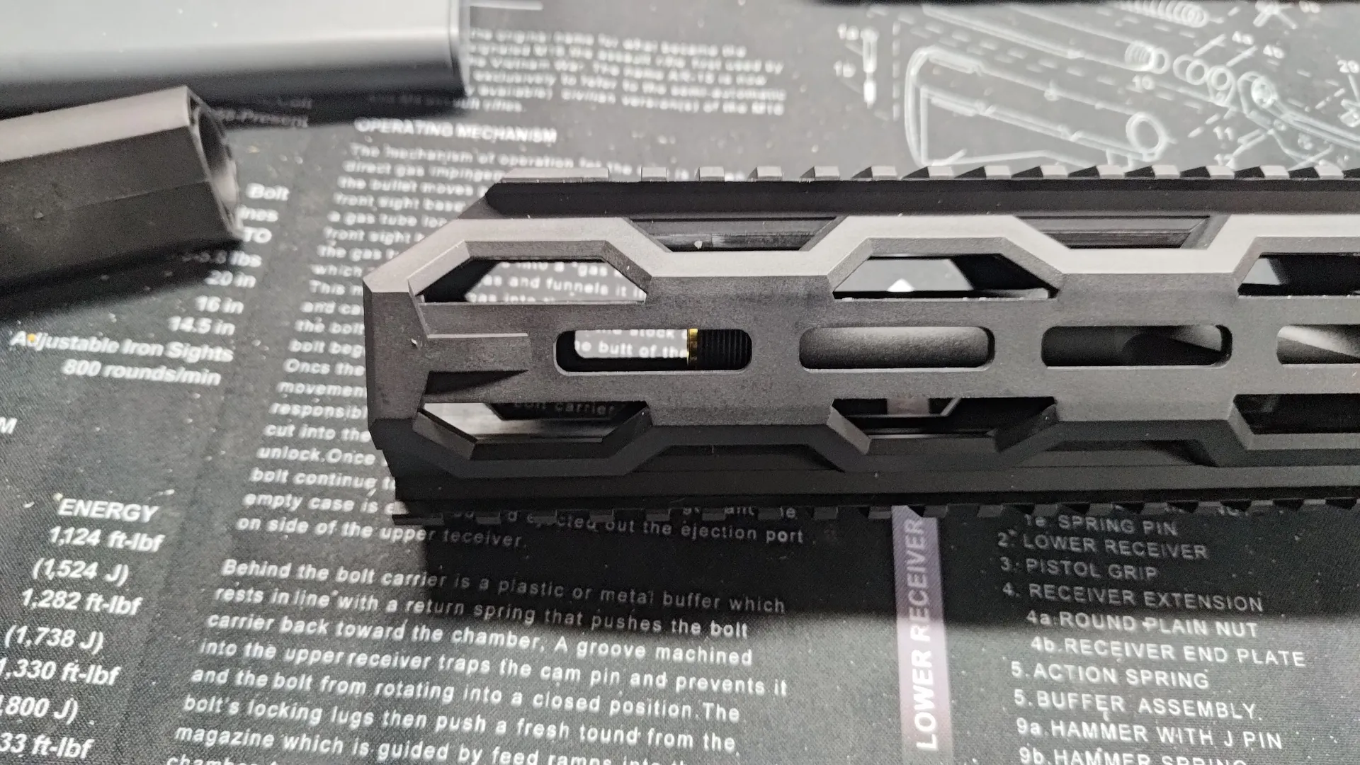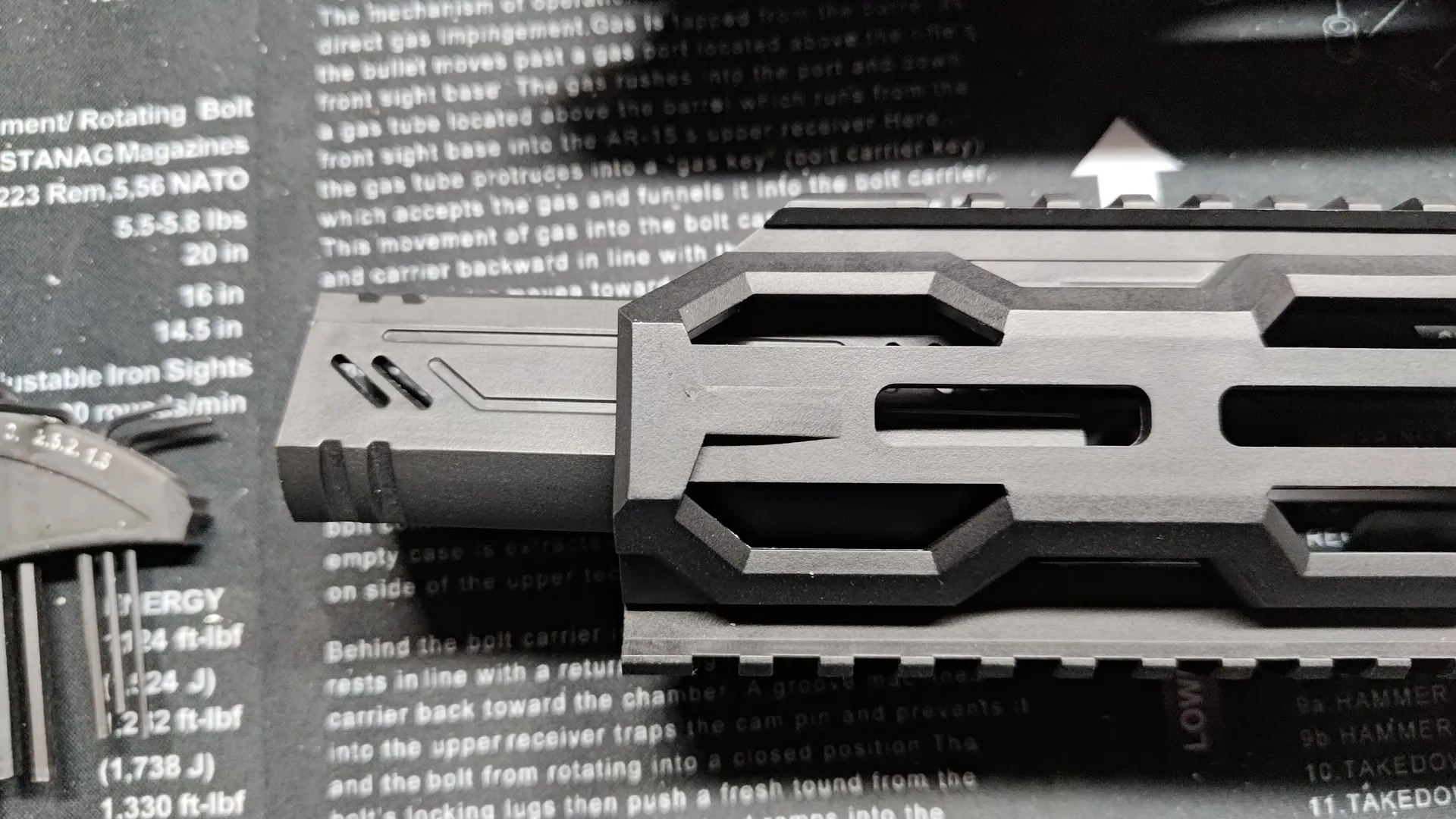 10inchアウターバレルに中サイズのSpearを取り付けると大体こんな感じで、最初のM-LOKあたりに14mm逆ネジがくるサイズ感で、HFCのハイダーを取り付けるにはちょうどいいサイズ感でした。