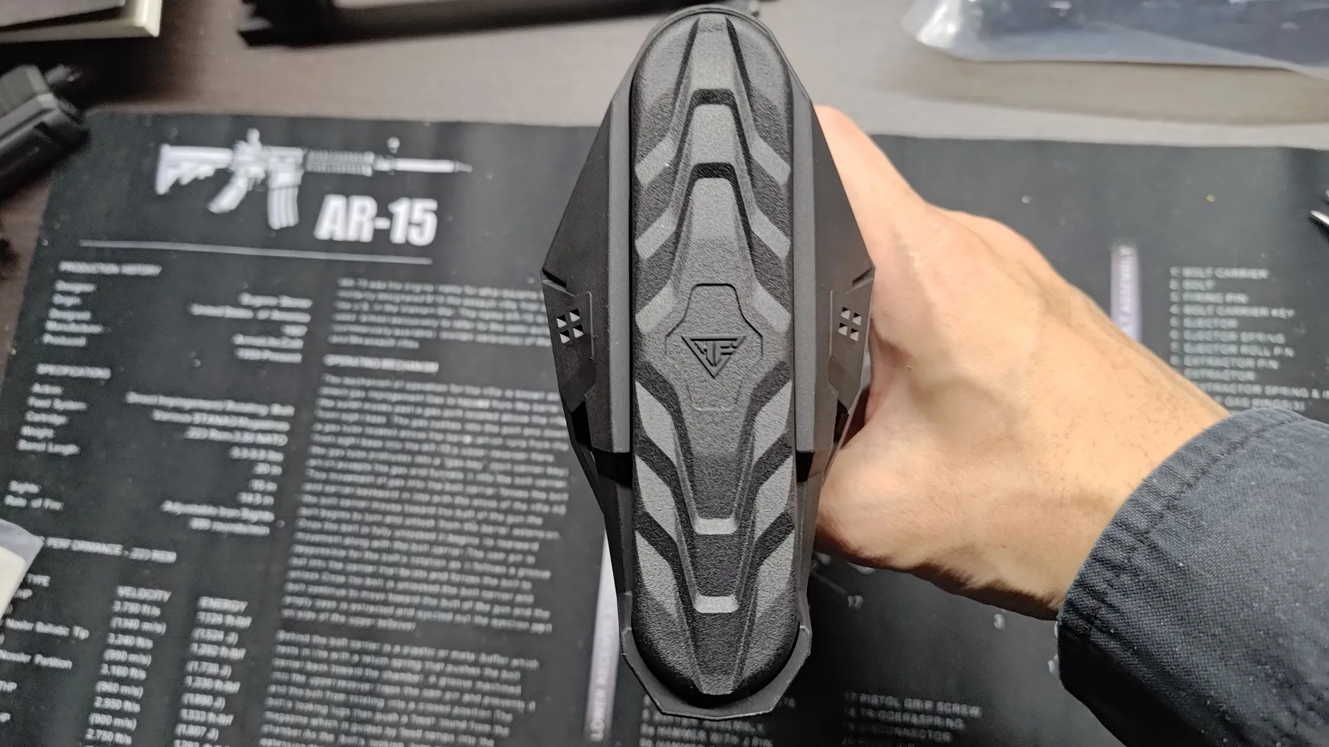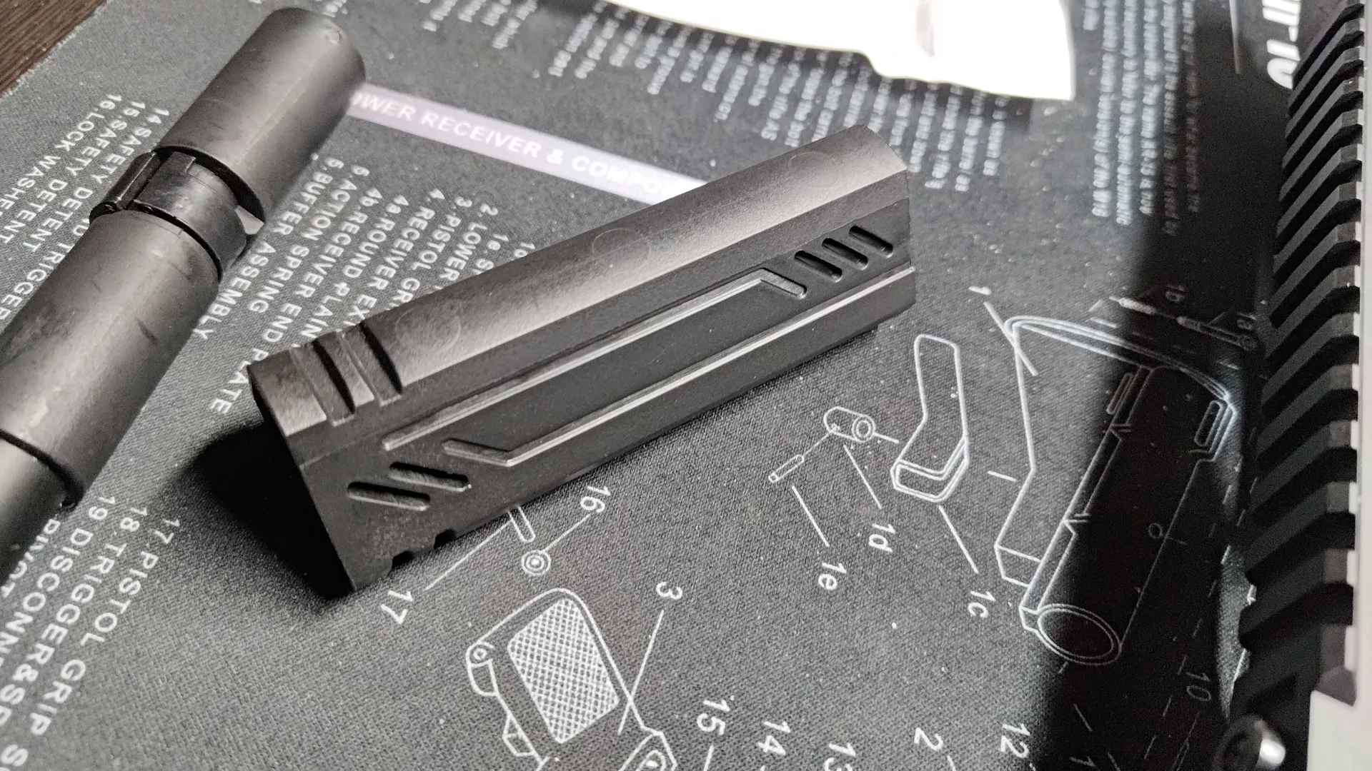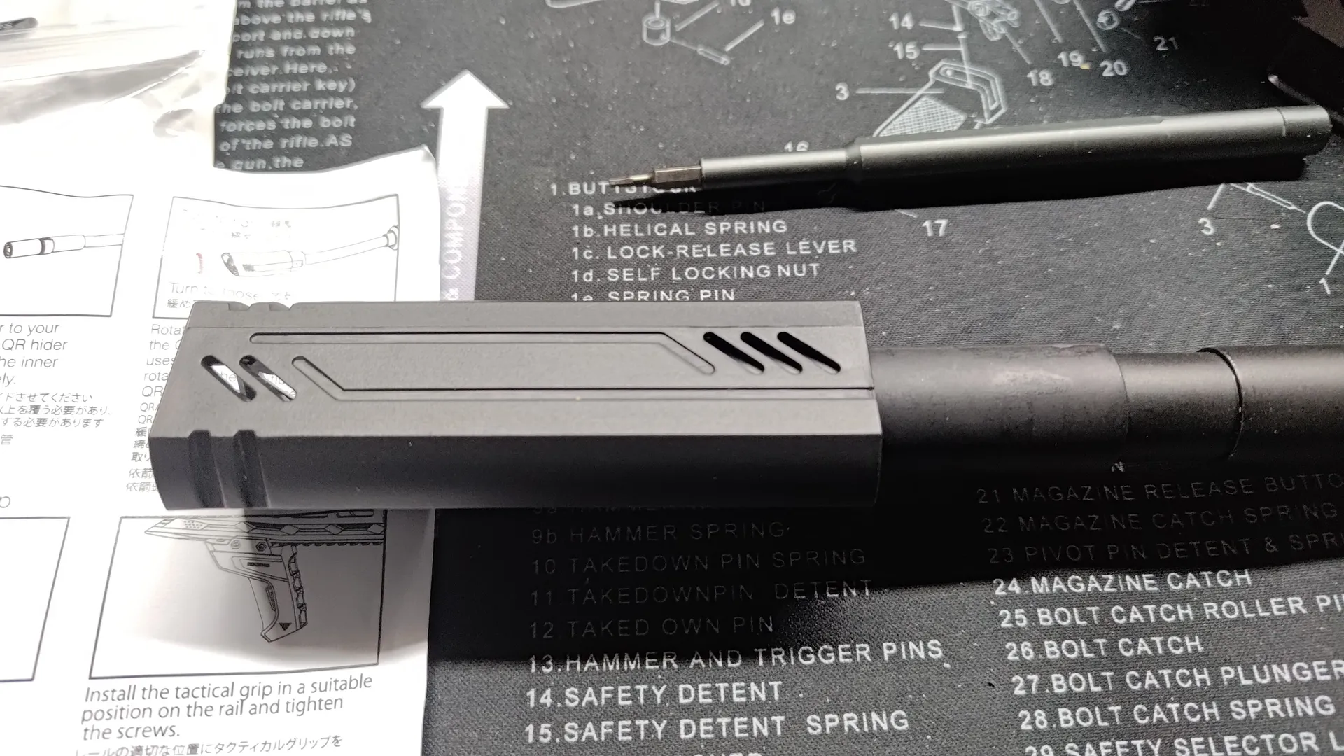 通常のバーチカルフォアグリップは下面に穴があいていて、底に蓋がつく構造が多いですが、こちらは形状的に下部に穴開けることができなかったんでしょうね。