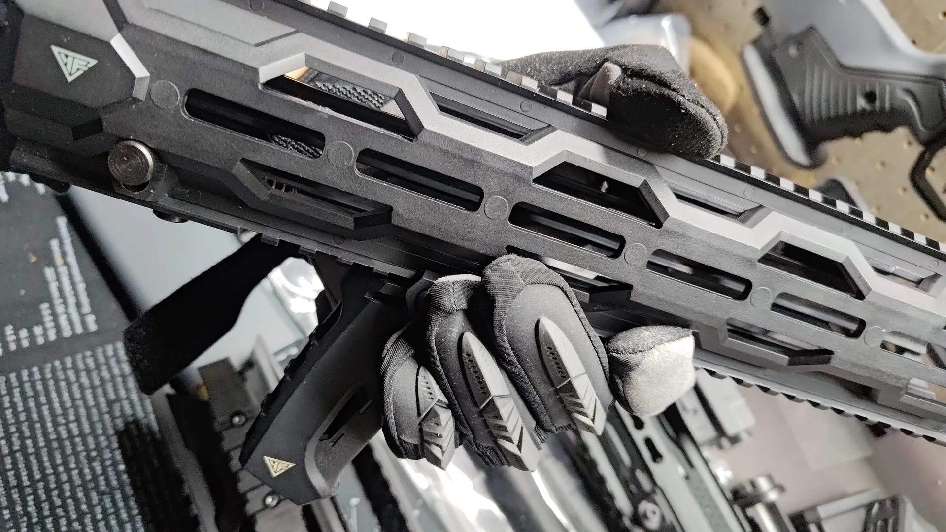 SwordのほうはLVOAのようなデザインの関係上、上下のピカティニーレールは先端まで来ておらず、少し手前で終わっています。 またサイドには脱着可能なM-LOK用のピカティニーレールが搭載されており、前方に少し飛び出しているのもこの追加分のピカティニーレールのデザインになっているため、追加ピカティニーレールを取り外せば、左右の前方絵の出っ張りはなくなります。