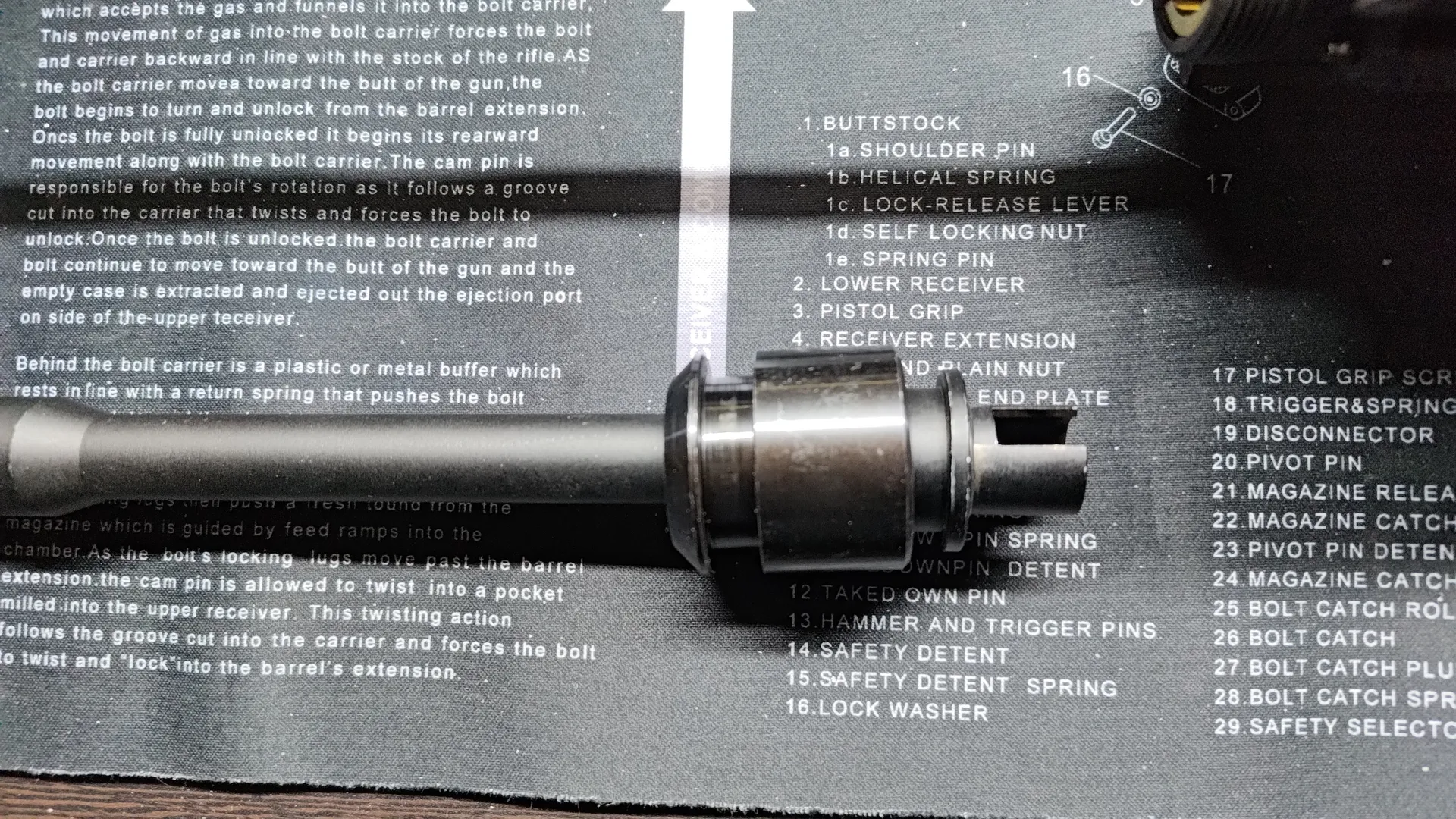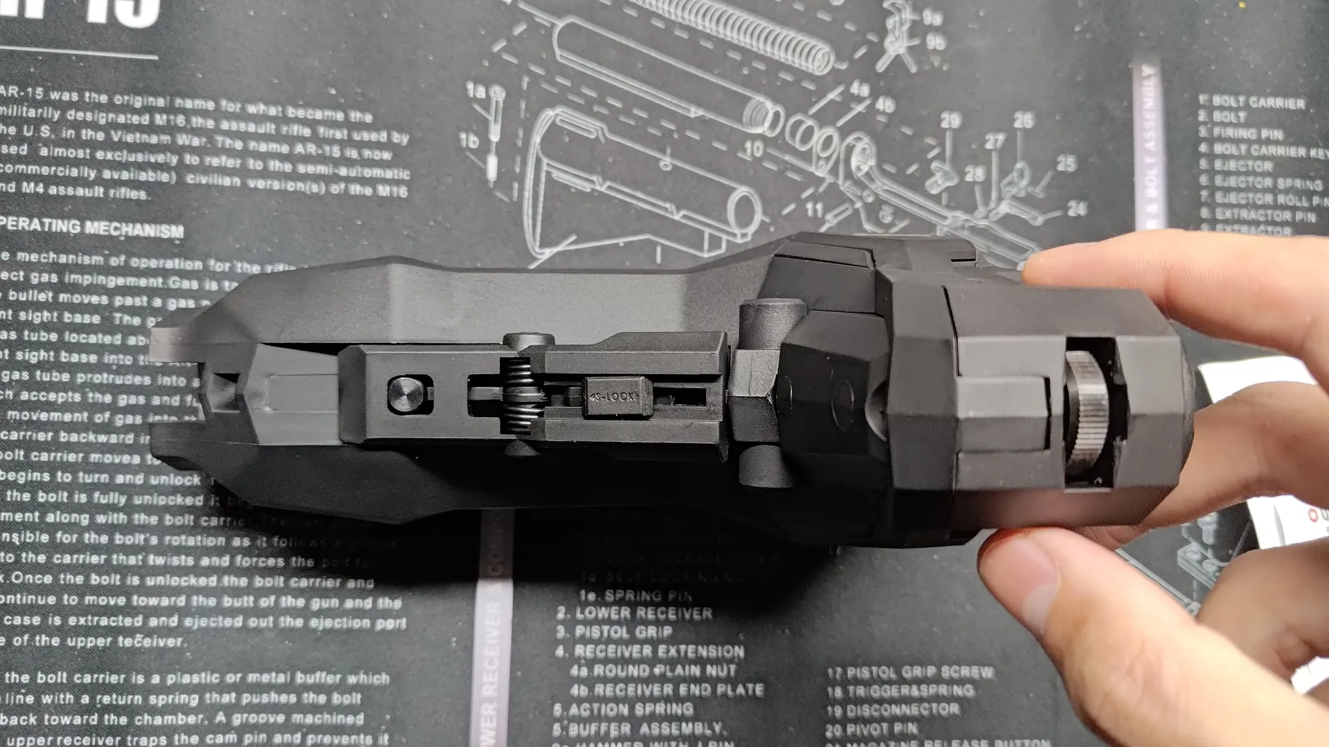 左右下部についている丸棒を下に引っ張ると下部のパーツが連動し、その状態でバレルナットとハンドガードが分離できるようになります。