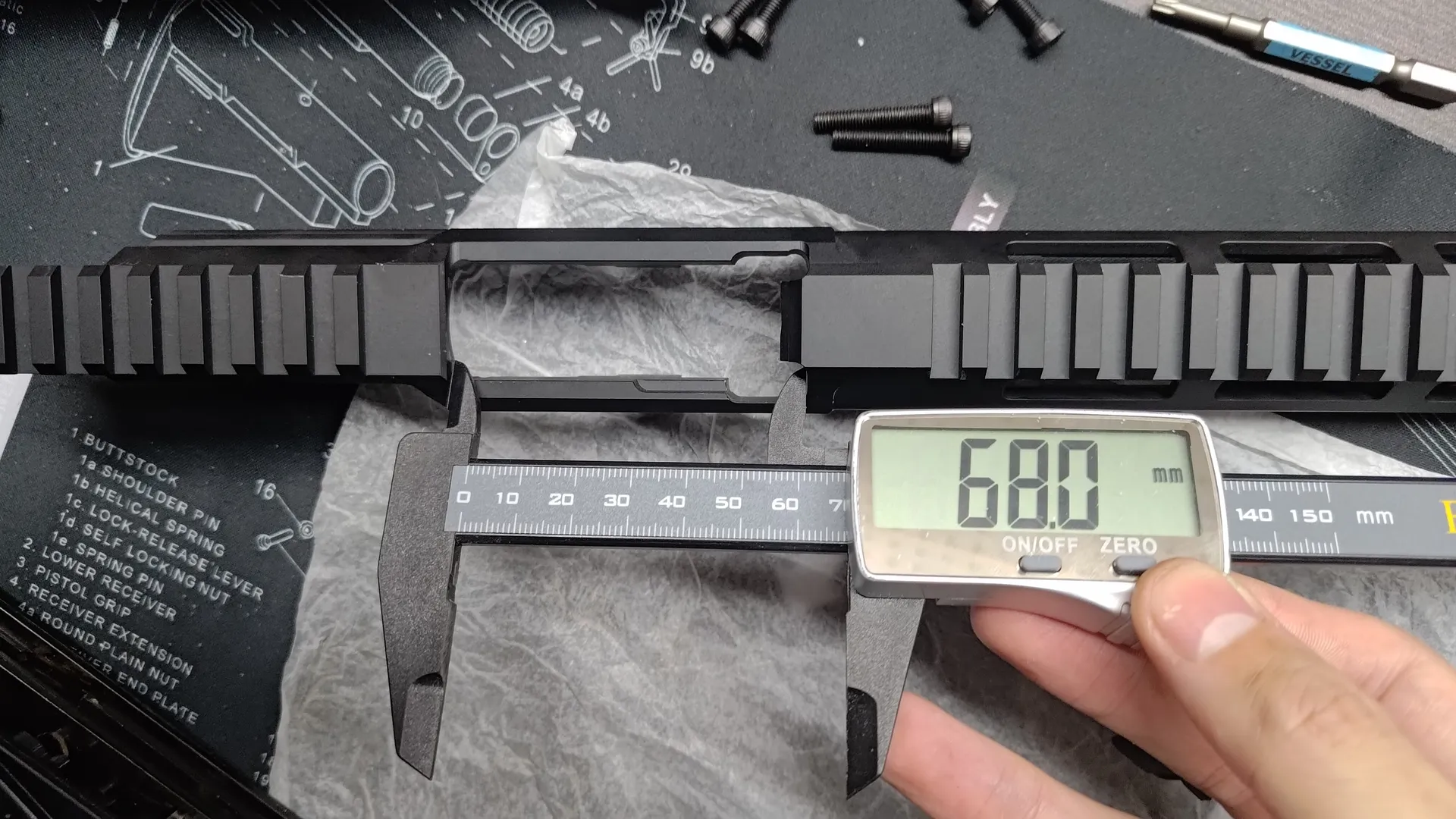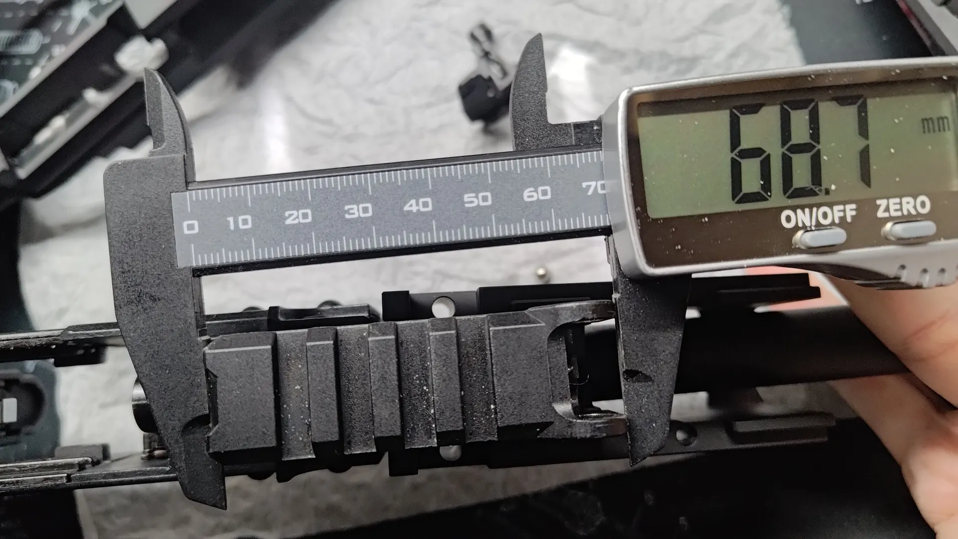 ここで出しますは、MK3のAKMのリアサイト部分がハマる切り欠きの前後寸法です。 多少の計測誤差はあるかもしれませんが、約68mmです。