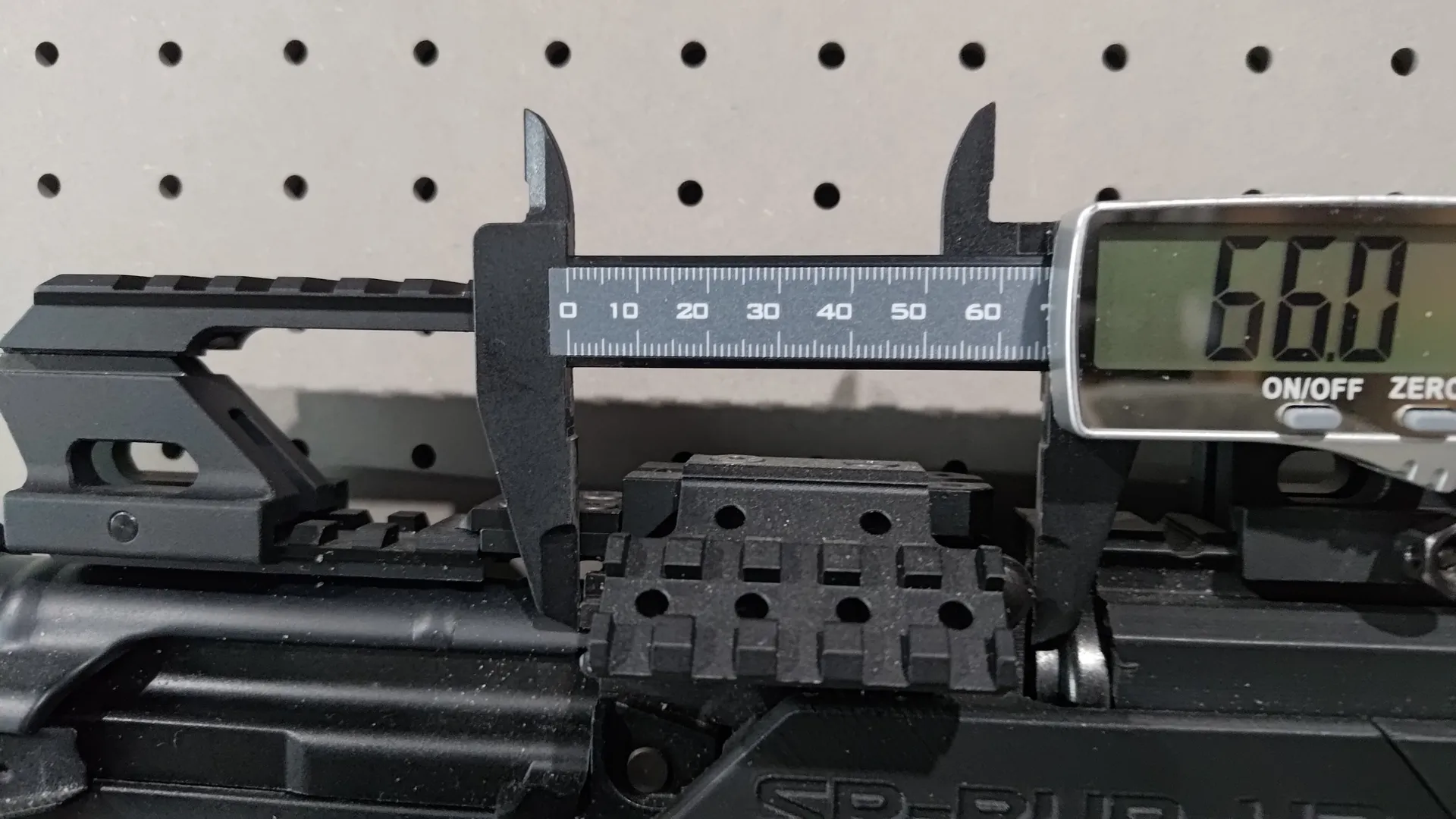 ちなみにレールが付いちゃってるので見えづらいですが、AKMの該当箇所の寸法はこの通り、約66mmなので問題なく入ります。
