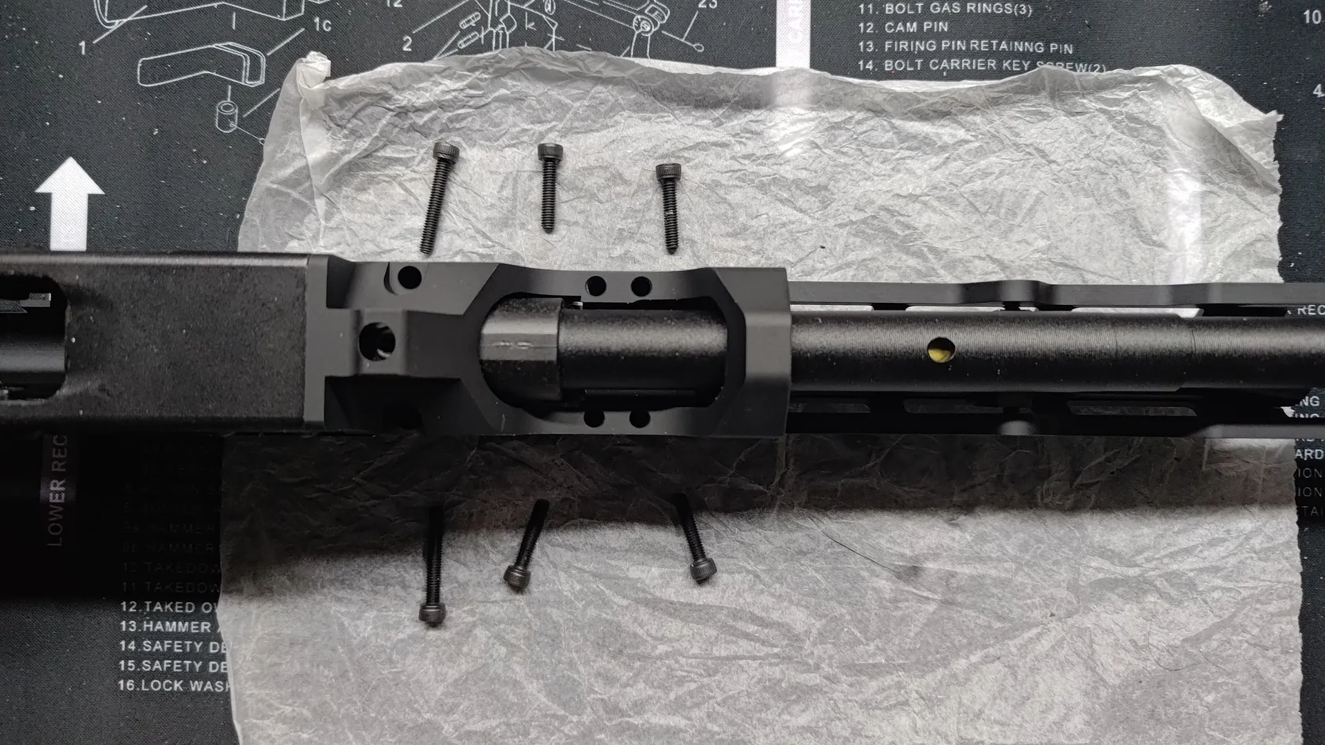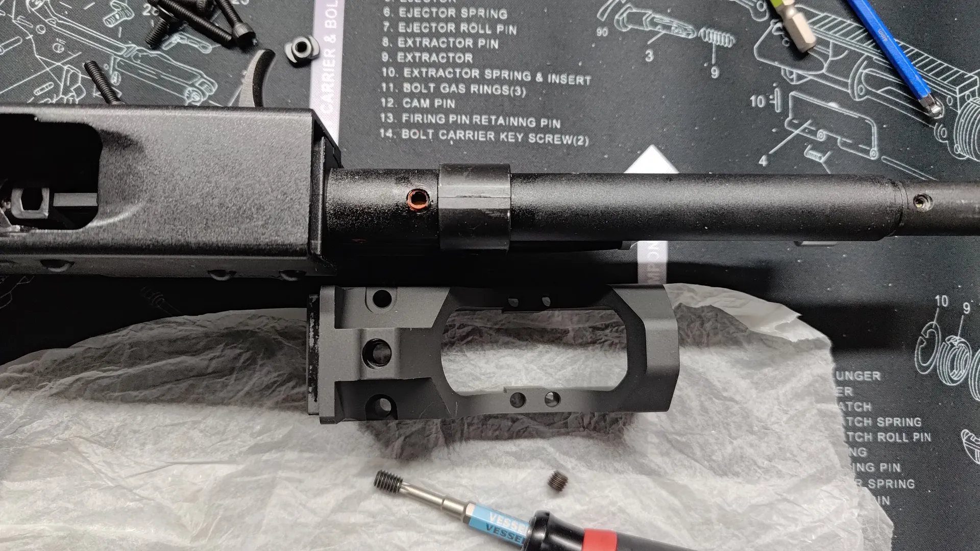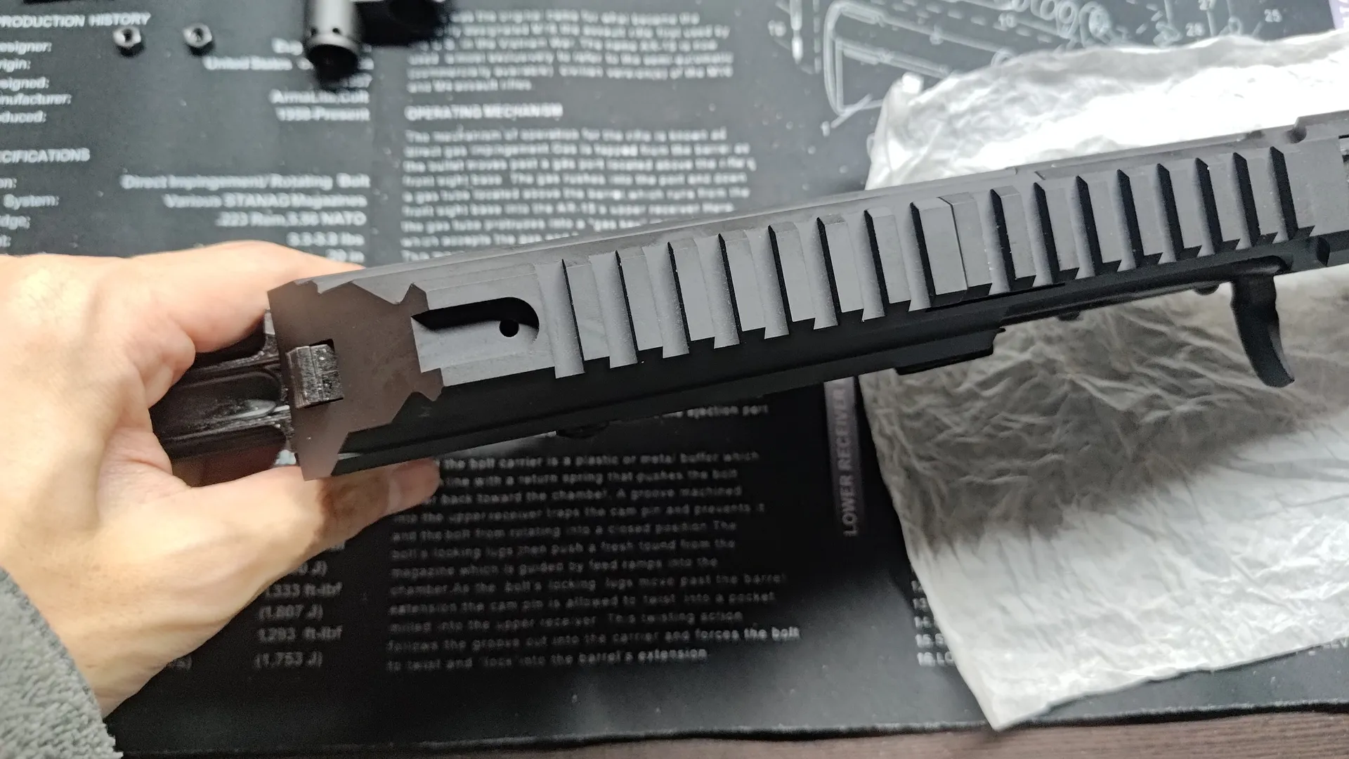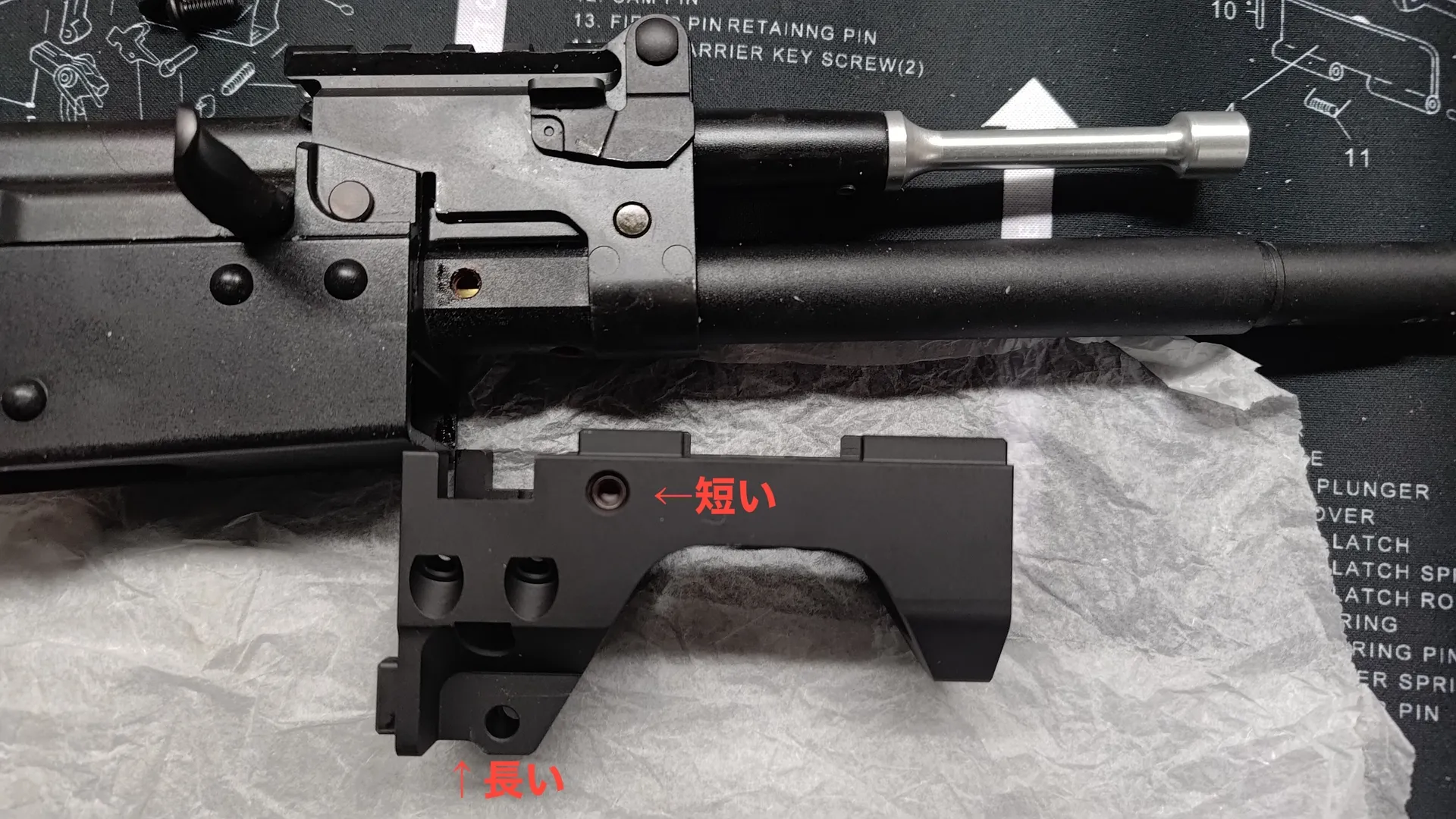 フロント周りと後部トップレールカバーですね。 ついでにボルトキャリア周りも外しておいたほうが良いかと思います。