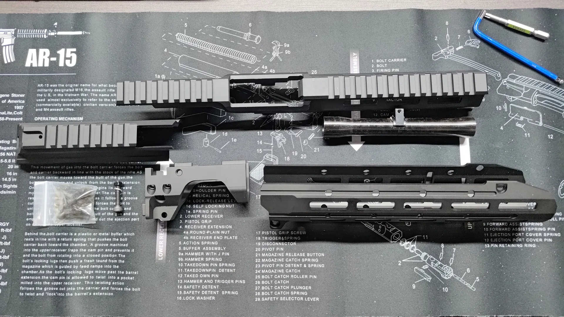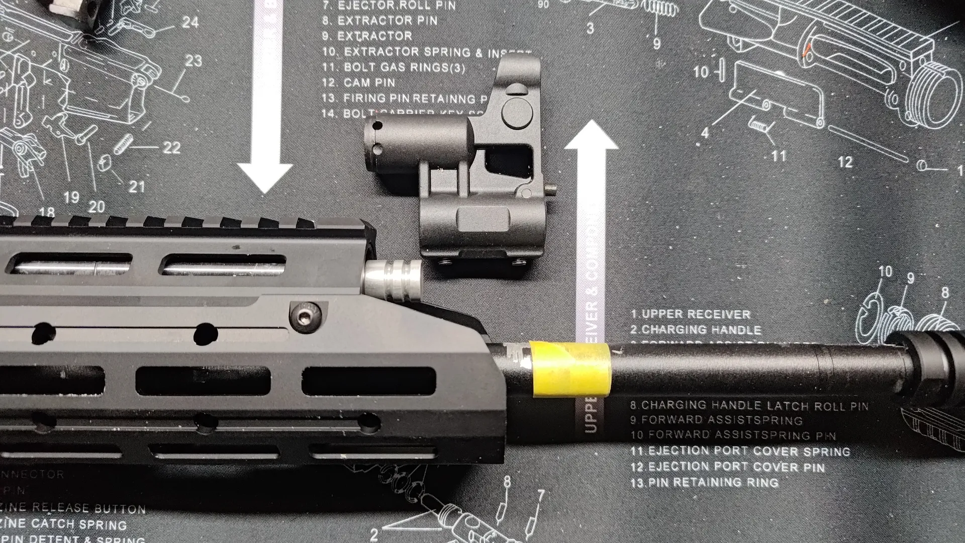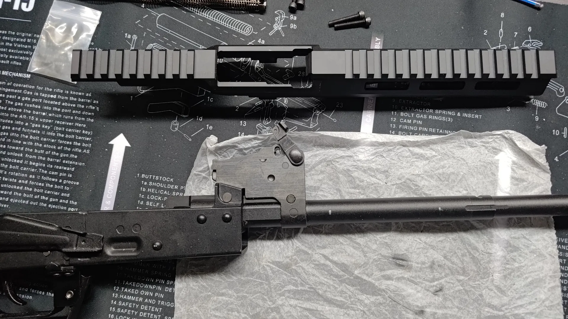 フロント周りと後部トップレールカバーですね。 ついでにボルトキャリア周りも外しておいたほうが良いかと思います。