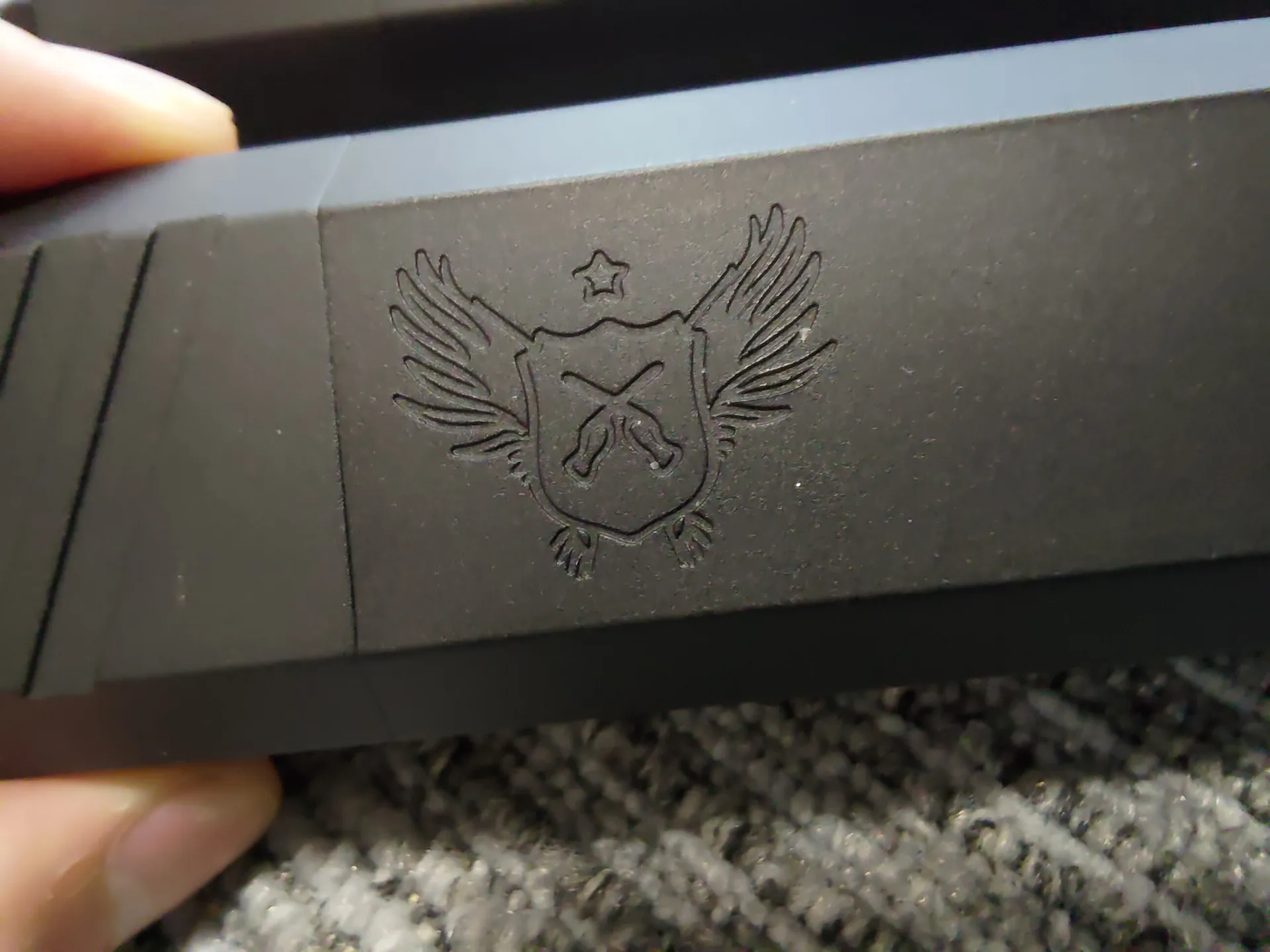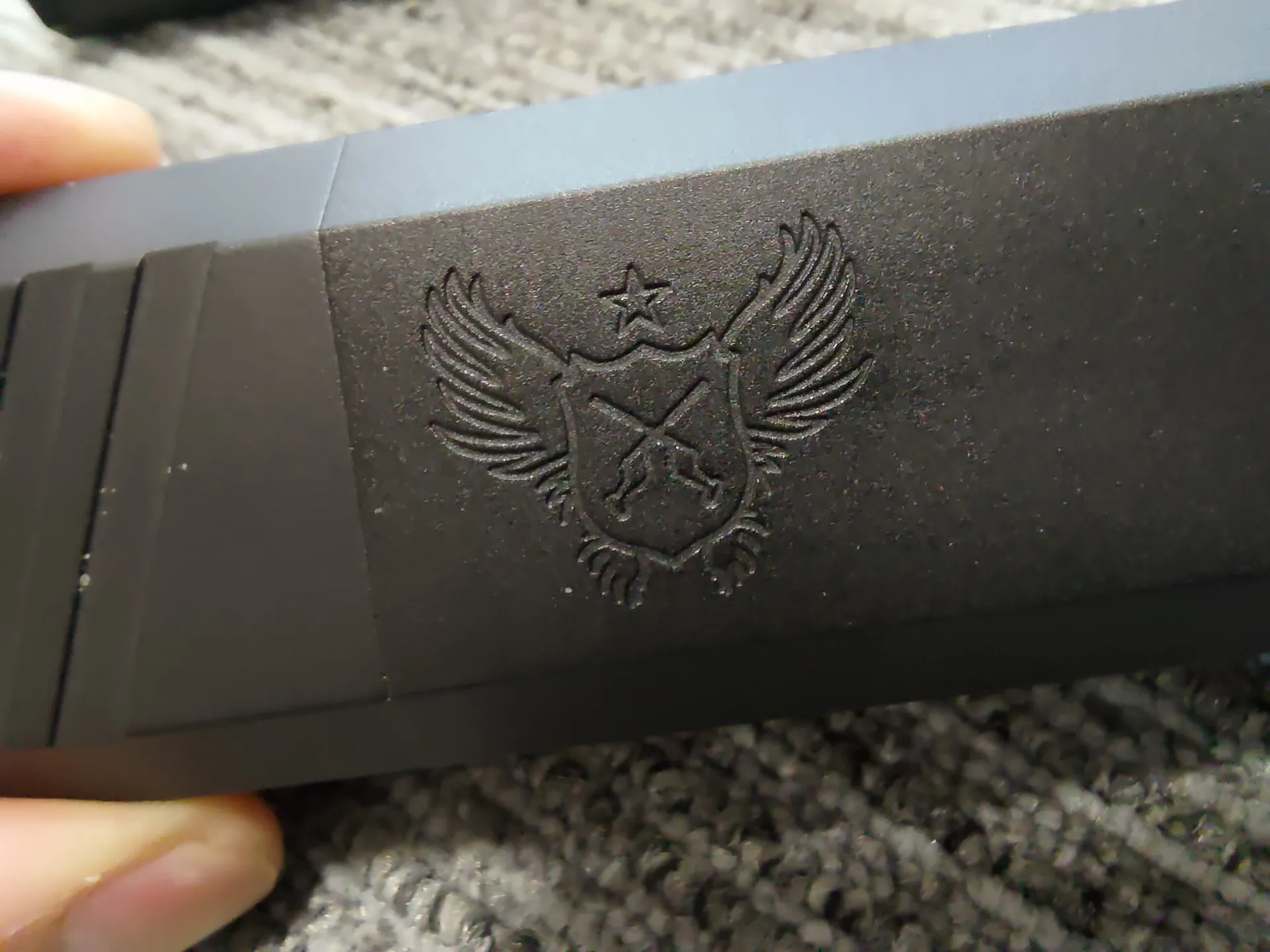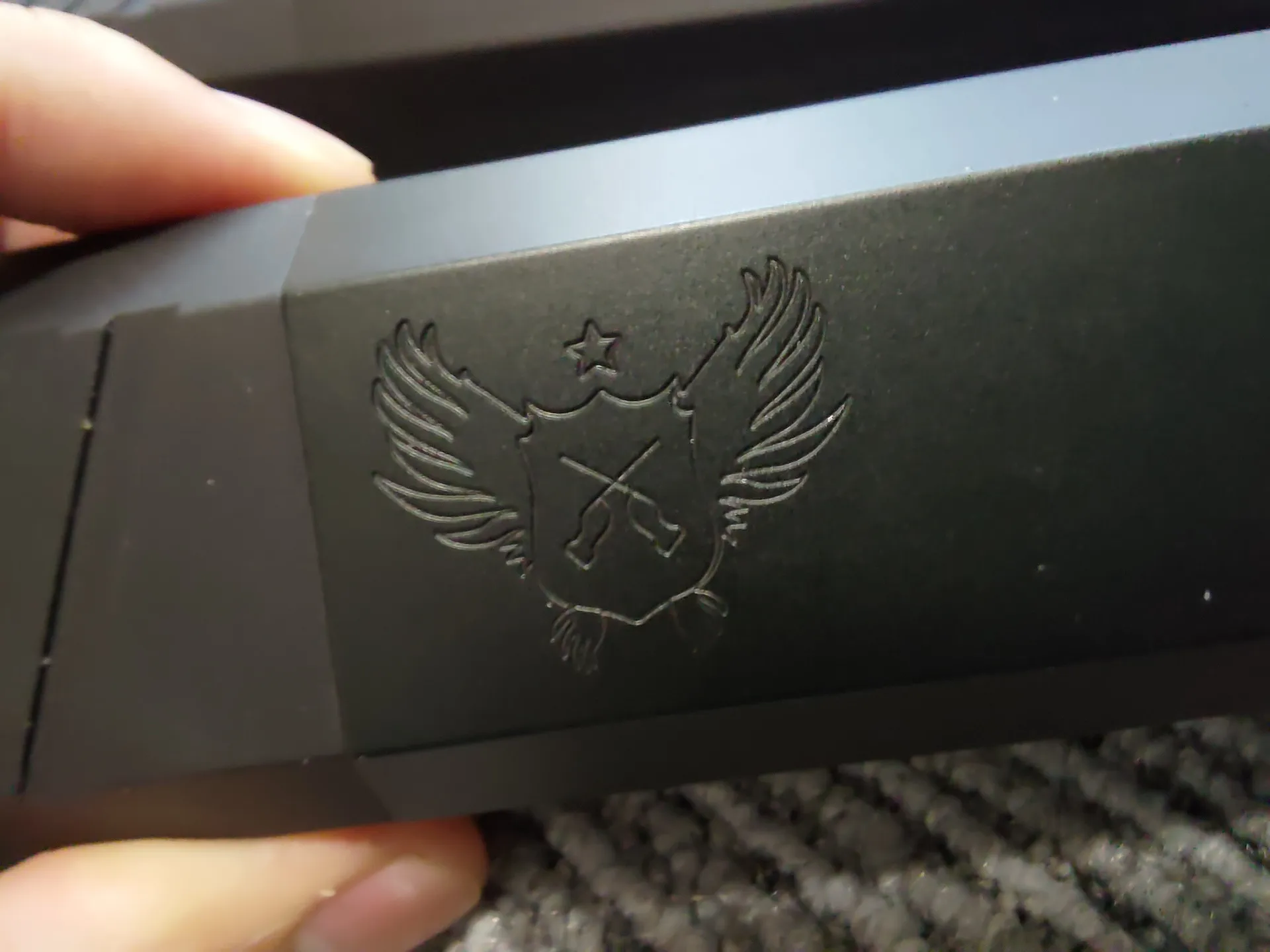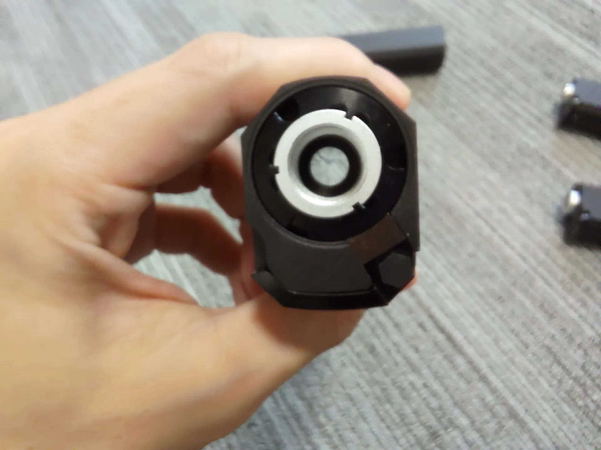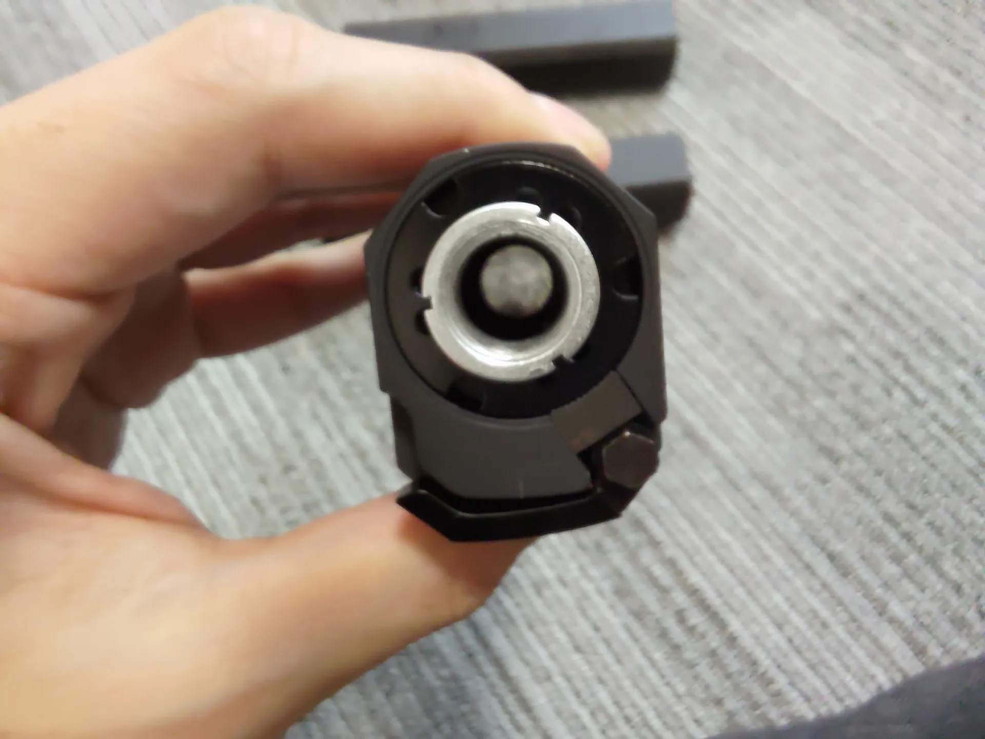 基部はマットな仕上がりで、筒よりもざらつく感じです。 筒の部分はマットよりの半光沢な感じで、手触り感は少しざらつく? 感じです(MWSのレシーバーより多少ざらつく感じ) とは言ってもザラザラってわけではないです。 基部と筒部分で色が異なりますね。前面プレートは基部っぽい感じです。