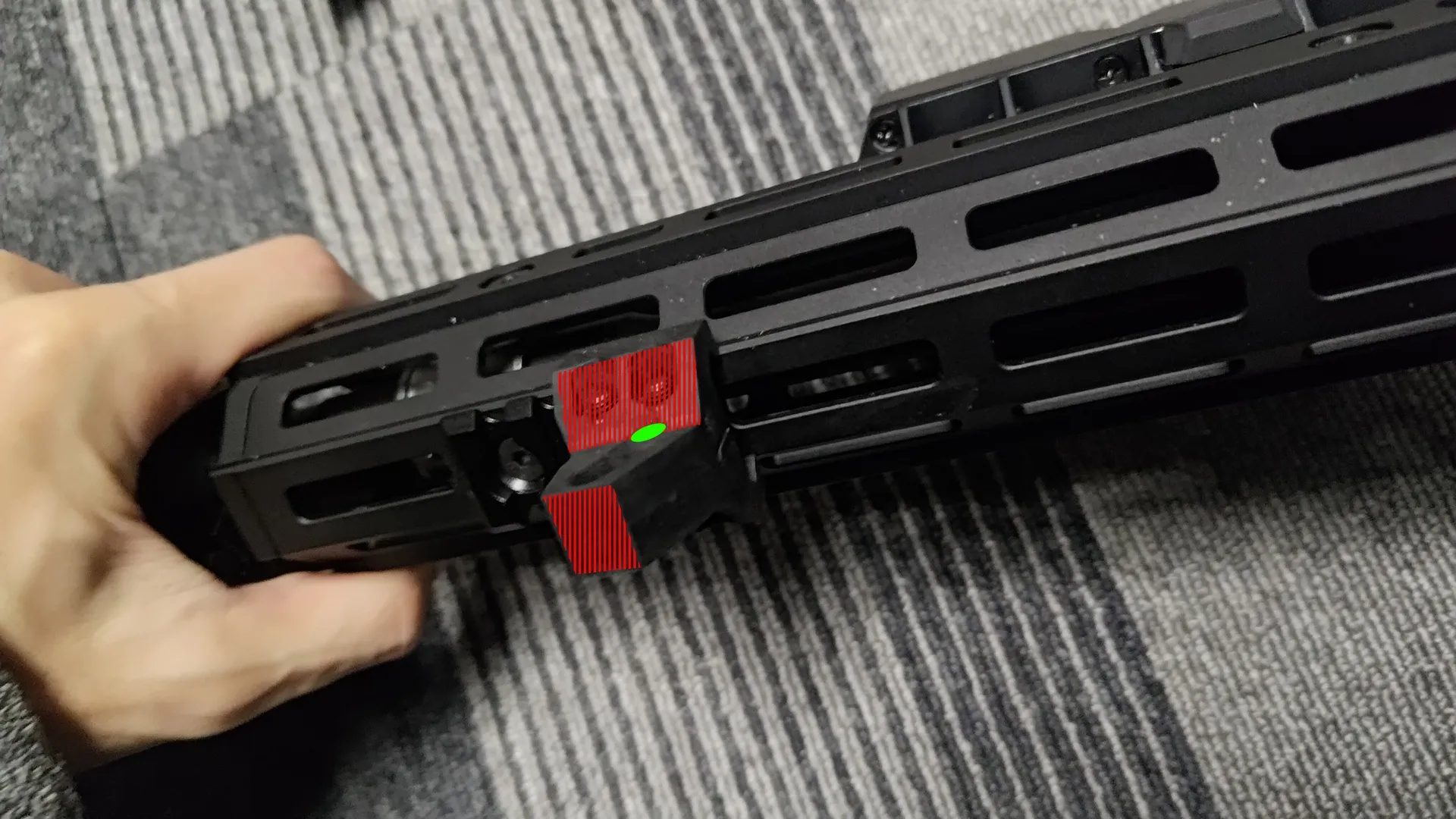 ただし、このままでは固定用のピンがさせないため、緑で塗っているピンが入る穴をハンドガード側に向けて延長する必要があります。