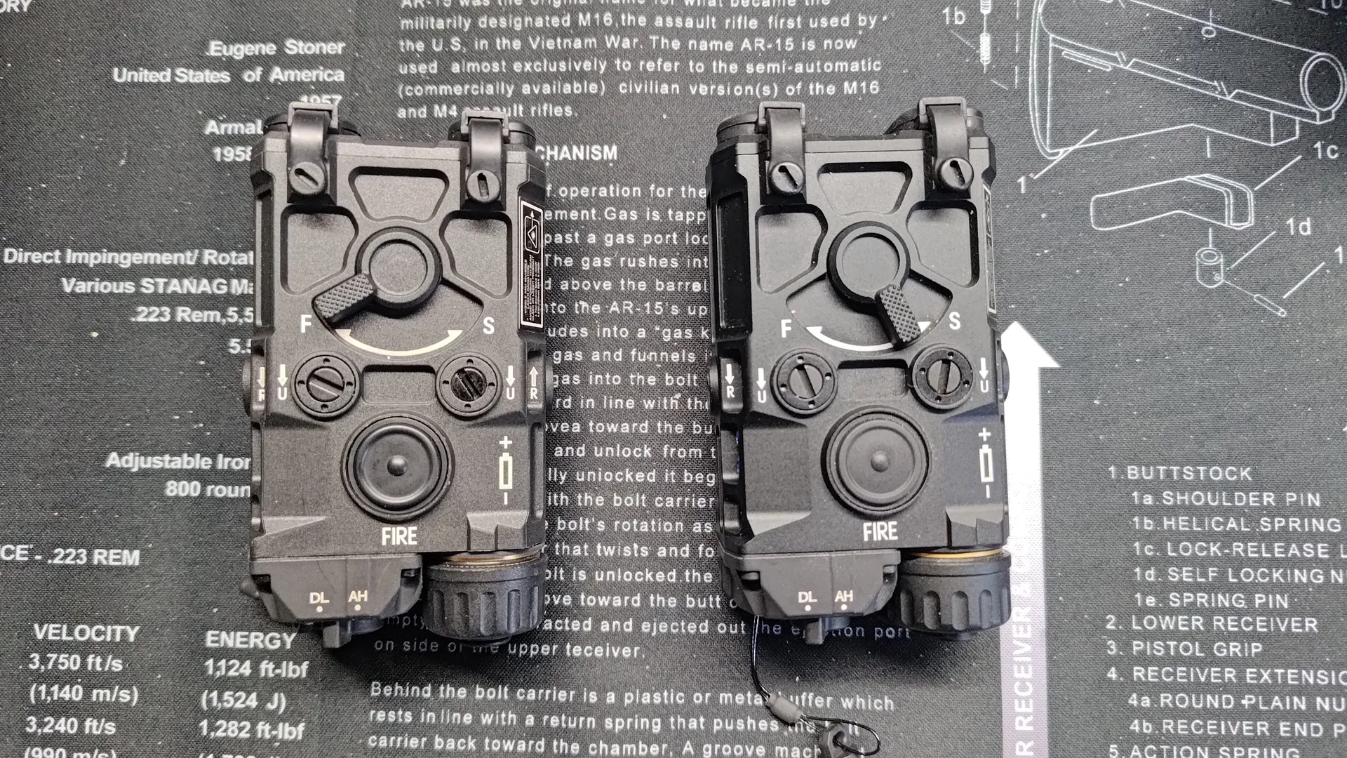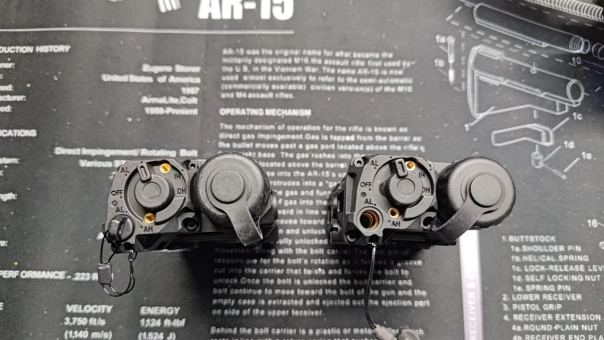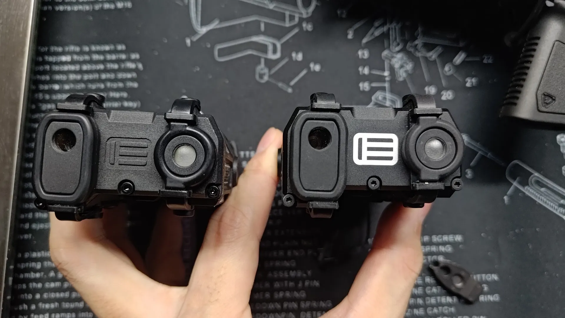 最後に底面ですが、樹脂製のほうは20mmレールへの固定する爪も樹脂に変更されています。 もちろん金属製の方は爪も金属製です。